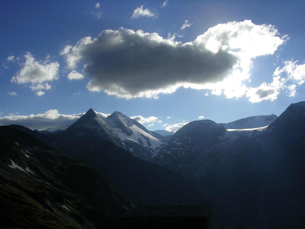 Оплатили въезд карточкой Master Card, получили билет и сувенирную наклейку (ей нашлось мест на холодильнике дома) и вперед. Все, дальше оставалось только понемногу ехать и останавливаться, ахать и охать на окружающие виды, щелкать фотоаппаратом, снова садиться в машину, проезжать очередные пару километров и опять останавливаться для очередной фотосессии. Постепенно мы поднимались все выше и выше, становилось прохладнее. а на высоте порядка 2000 метров кольцо с разъездом на видовую площадку Кайзера Франца(2390 м) и Зальцбург. Естественно, сначала на эту площадку. Здесь трехэтажная бесплатная парковка, на которой мы оставили машину, одели куртки и пошли смотреть на сам GrossGlockner (3798 м) и ледник, языком стекающий с соседней горы. Потихоньку прогуливались по площади Европы, на которой установлена бронзовая лодка, символизирующая бесконечное течение времени, мы впитывали все окружающее. Главная достопримечательность немного прятала свою вершину в облачном языке, который обманчиво обещал вот-вот от горы оторваться. И я даже с пяток минут простоял с нацеленным фотоаппаратом, но облако прикреплено было прочно, как флаг на флагштоке. |