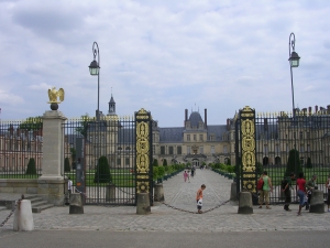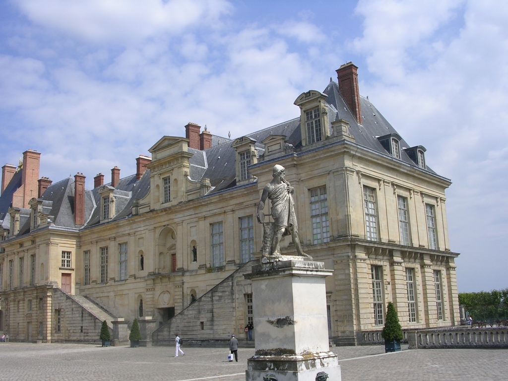 В Фонтенбло мимо дворца не проедешь, он в глаза кидается своей парадной площадью Белой лошади (а лошади то и нет). Парковка, как водится, тут же рядом, со шлагбаумом, но мы мимо, оглядеться. Везде натыканы парковочные автоматы, свернул в тихую улочку - их и там полно. Поэтому покружились, покружились и решили встать в тенечке возле одного из них, благо, что от дворца мы все равно где-то рядом. Встали, подошли к ящику, а на нем вроде как написано, что по понедельникам бесплатно. На всякий случай про себя по-французски посчитали дни, я кинул маленькую монетку и мне дало окончание времени парковки завтра утром. Поэтому ура, монетку вернул в карман и мы пошли на осмотр королевской дачи.