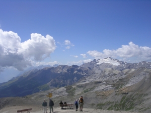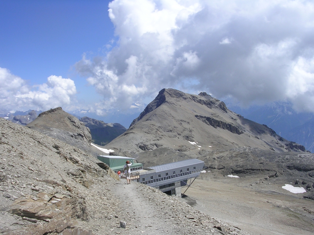 Привезли нас на промежуточную станцию, здесь уже никто не спешит, есть ресторанчик, стоят лежаки для желающих отдохнуть и позагорать на солнышке, для детишек устроена прыгалка. Станция на высоте 2250 метров. Отсюда наверх уходят вагончики побольше, без сидячих мест и по расписанию. До ближайшего отправления было примерно полчаса и мы немного позагорали. На солнце жарко, а в тени и в продувных коридорах начинает пробирать холодком и куртки пришлось натянуть. С обзорной площадки видно Монблан, а если быть точнее, видно облако, которое закрывало вершину Монблана.