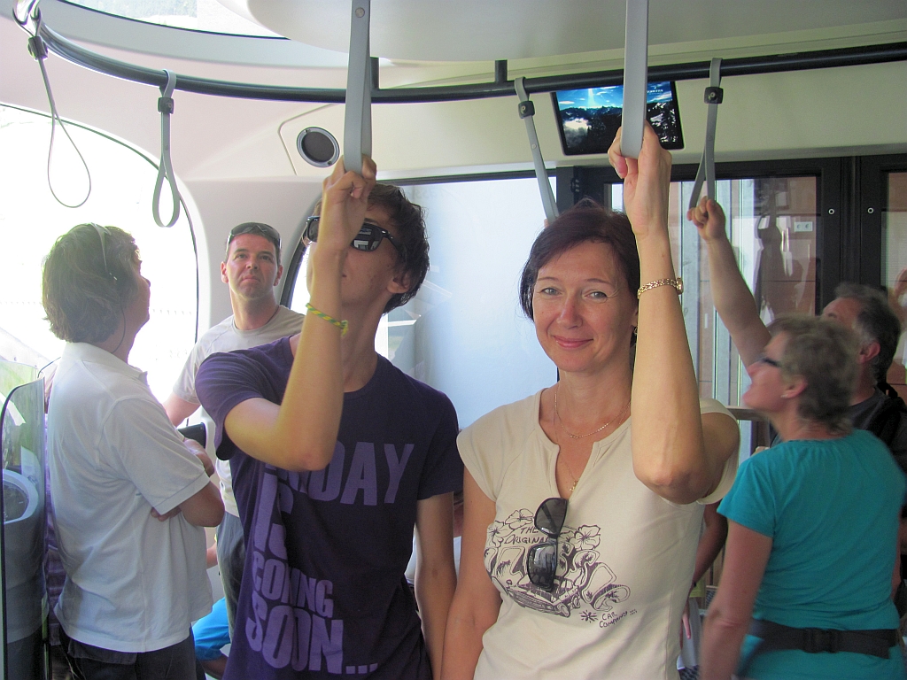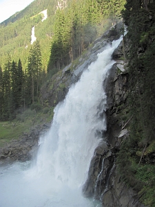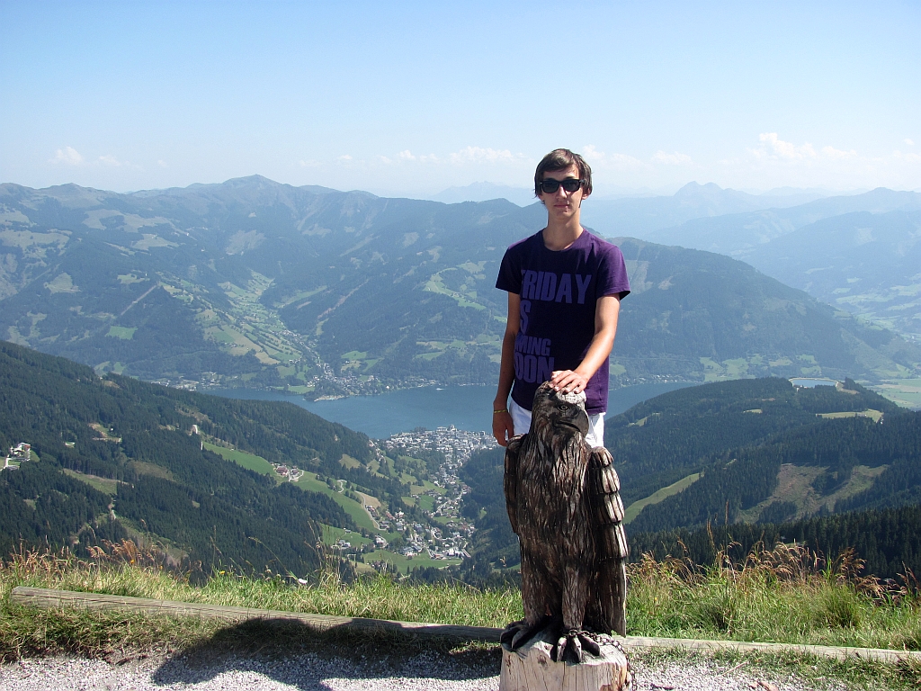 Проехали мимо поворота на Гроссглоккнер (107 -я дорога), с которого мы спускались в 2008-м году, а там совсем рукой подать. Вот же как много всего собралось в одном месте грандиозного. И я уверен, что его на самом деле здесь намного больше, чем я думаю. В Цель-Ам-Зее легко по указателям нашли подъемник на гору Schmittenhohe (2000 м) и, кстати, около него бесплатная парковка без всяких ограничений. И стоимость подъема 60.8 евро с троих была для нас уже приемлемой, особенно под впечатлением от швейцарских цен. Т.е ровно в три раза дешевле, чем на такую же по высоте гору Pilatus. Это даже не проценты, а разы... У Марины была мысль спуститься с горы пешком. Но, во-первых, ее активно не поддерживал Илья, я колебался и весы склонились к нам. Кроме того, я думал съездить потом еще куда-нибудь, а так мы могли уже не успеть. Подъемник одноступенчатый, сразу приезжаем на конечную, без пересадок. В вагончике непрерывно крутят фильм о торжествах по случаю открытия. Кроме того, здесь активно предлагают заняться метательным спортом - кидать надо тарелки и на съемках это выглядело забавно. Наверху немного портила впечатление стройка, сразу на выходе из терминала стоит щит с извинениями и благодарностями за понимание. Что-то я такого щита не увидел на входе в терминал внизу :). Но в остальном все замечательно. И воздух, и виды на городок и озеро под нами, и окружающие нас горы. Понравился бинокль, в который можно крутить по сторонам и когда в его визир попадается какая-то известная вершина, на экране появляется ее название и высота. А видно отсюда больше тридцати трехтысячников, если верить проспектам. Мы не пересчитывали :). Еще наверху на площадке мы увидели фотомонтаж путешествия на гору императрицы Сисси, которая пришла сюда пешком. Этого было достаточно, чтобы Марина начала нас измерять уничижительными взглядами. Сисси дотопала вверх, а мы вниз отказались спуститься... Особенно меня. Но мы не королевских кровей, поэтому, посидев на скамеечке, пошли гулять по горным тропинкам. Хотя их горными назвать можно только их высоте над уровнем моря, прогулка была совершенно не напрягающей. Как часто бывает на таких горках, здесь развиты летательные аттракционы. Мы долго наблюдали за разгоном планера над нами, его таскал, таскал маленький самолетик, а потом бросил парить в небе одного. А потом смотрели, как желающие улетают вниз на парапланах в сопровождении и иногда даже по принуждению инструктора. И прогулка вдруг закончилась, мы оказались сначала в подвешенном вагончике, а потом внизу около машины. И решили мы ехать не назад, а дальше. На криммльские водопады, потому что в путеводители было написано, что это самые высокие водопады в Европе. А мы их не видели и до них ехать всего-то 50 км по той же самой трассе. И скоро появился Криммль. Надо проехать через поселок по указателям на водопады и их становится видно из окна машины. Скажу честно, это и вправду незабываемо - высокие лесистые горы и мощная струя воды почти с вершины одной из них. Сразу стало понятно, что приехали не зря. Парковка есть прямо у входа, но показалось, что платная, и мы проехали дальше метров 100 по дороге, которая идет на Zell-am-Ziler, одна из немногих дорог с дополнительной оплатой. Может быть, стоило проехать и ее, но время поджимало и мы не поехали. Не поехали, а поставили машину на бесплатной парковке вдоль дороги. На осмотр водо