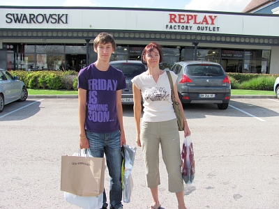 Как уже сказал Сережа, мы не очень большие знатоки и любители шоппинга. Но пообещав нашему уже взрослому сыну это "развлечение", пришлось держать слово. Торговый комплекс, состоящий из более ста различных бутиков (одежда, обувь, белье, спортивные товары, товары для дома и пр., правда, нет ни косметики, ни парфюмерии), располагается овалом, внутри которого находится парковка. Покупатели передвигаются по довольно широкому тротуару, вдоль которого для уставших стоят скамеечки. Магазины, конечно же, распознаются по вывескам и по плану, который можно взять и в отеле, и в любом магазине. Некоторые названия были нам знакомы, некоторые нет, поэтому мы решили заходить во все, интересующие нас, в первую очередь сына. На входе ориентировались по ценам и решали, стоит ли нам продолжать осмотр или нет. В некоторых магазинах проводились акции : 2-я вещь за 1 евро, 3-я вещь бесплатно. К обеду, ничего не купив, но присмотрев некоторые вещи, решили перекусить в Макдоналдсе. Там нас обслуживала милая русская девочка Оля, которая уже давно с родителями живет в Труа. Она нам сказала, что есть еще одна часть торгового комплекса, состоящая из 85 бутиков. Тут уж и мы как-то скисли. Но выйдя из кафе, пробежались и по этим магазинам, многие из которых начали нам казаться какими-то рыночными павильонами с рыночными товарами. Как-то забылось, что мы во Франции. Затем более осознанно мы вернулись за теми вещами, которые присмотрели ранее и в итоге купили почти все, что хотели: джинсы "Levi's" за 60 и 40 евро, толстовку "Levi's" за 20 евро, рубашку за  12 евро, по акции купили кардиган за 30 евро + поло за 1,5 евро, куртку "Lee" за 35 евро и кое-что еще. Себе я в одном магазине купила юбку, брюки и кофту какой-то неизвестной мне французской фирмы "Renatto Bene", заплатив за это 109 евро. Я считаю, что это недорого, учитывая качество этих вещей просто на ощупь (такие приятные!) и этикетки "Made in France". Илюшка присмотрел себе швейцарские часы "Swatch", но без папы мы не решились на эту покупку и вызвали его. Папа одобрил и часы были куплены как подарок  за поступление в институт. Цена - 83 евро  оказалась значительно ниже, чем, как мы потом увидели, в Швейцарии. На этом наш покупочный день закончился. Приехав домой и походив по нашим магазинам, я поняла, что не очень правильно оценивала цены в евро (в пересчете на рубли они казались высокими). Турецкие и китайские вещи у нас намного дороже.