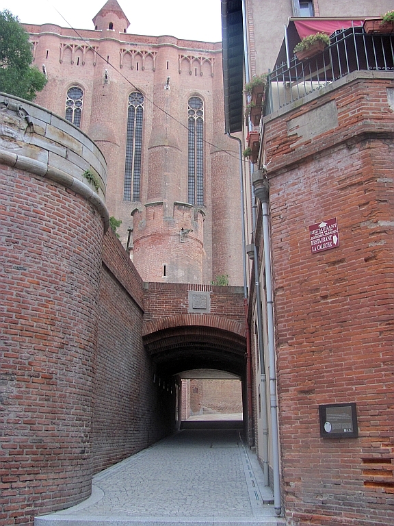И снова по узким дорожкам мы ехали среди сел и городков и скоро название Albi сначала появилось на указателях, а потом на щите. Конечно же, эти коварные французы к нашему приезду задумали подновить объездную вокруг города и именно в том месте, где находился съезд к отелю. И не успели. И конечно, нужный съезд они замаскировали дорожными пирамидками так, что я его не рассмотрел, хотя навигатор честно бухтел - съедь, пора... эх проехали...:). Ну да, проехали. Крючок получился небольшой, километров в 10 в одну сторону, потом неочевидный разворот, немного больше в обратную, снова уже простой разворот на кольце и попытка номер два. Тут уже я прокрался как надо между этими красными пирамидками и попал наконец в свою дырку :). Отель Formule 1 нас ждал. Занесли свои штатные поклажи в номер и снова в машину, на осмотр города. К центру от отеля идет хоть и узкая, но прямая как стрела улица, Расстояние километра два. И вот уже мост через реку Тарн и перед нами странный, красный, а при ближайшем рассмотрении, весь сплошь кирпичный, город. Дорога в центр ведет через мост, потом надо сворачивать к внушительному красному собору. Опять прямая дорога и мы на площади. Но запарковаться тут нельзя, знаки нас выворачивают назад, к мосту. Сделали еще кружок и опять на ту же улицу... И здесь вдруг нам попался пустой карман рядом с парковочным автоматом. Дальше уже началось более основательное исследование местности. И сразу же стали встречаться очень интересные здания, а потом мы вышли на соборную площадь, которую буквально накрыл своей махиной собор Святой Сесилии. Просто так его и не осмотреть, обошли вокруг, внутри он не кирпичный, но объемы поражают еще больше. Потом в старый кирпичный город, который то и дело открывал нам свои чудесные красные виды. На площади какая-то молодежь радовалась Мексике, скандировала непонятные лозунги и то и дело ныряла в струи фонтана, иногда вырывающиеся прямо из мостовой. Илье тоже явно туда захотелось, а мне захотелось взять его за руку, чтобы не увели :). За руку не взял, просто мы через завораживающие кирпичные улицы вернулись к собору. Оказывается, и из вроде бы обычного красного кирпича можно сделать красивый город. И что интересно, даже новостройки там все из подобного кирпича и в одном или в похожем стиле. Совершенно для нас неожиданно и запомнилось. И закончив прогулку, мы вернулись к ожидающей нас машине и по той же улице, что ехали сюда, быстро оказались дома, вернее, в отеле и день закончился, как всегда, ужином, а с ним закончился и этот эпизод. Переходим к следующему. За день проехали 234 км.