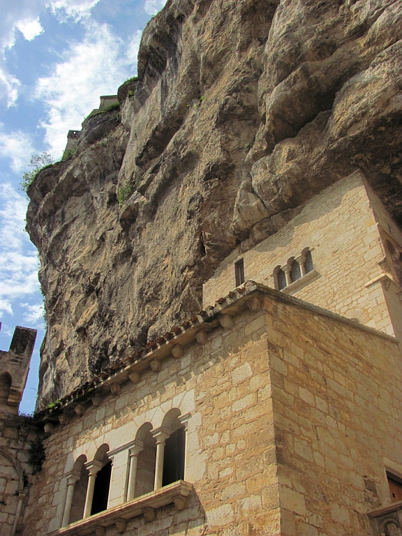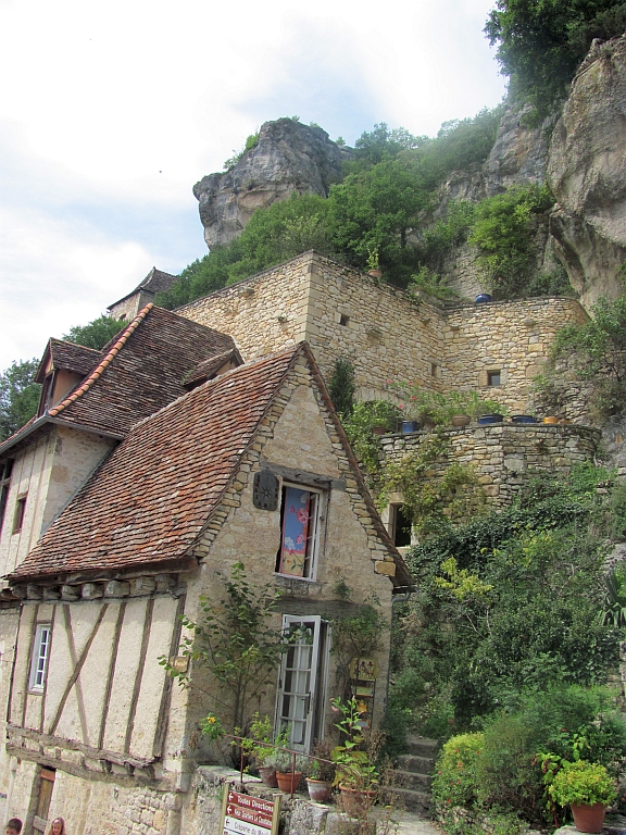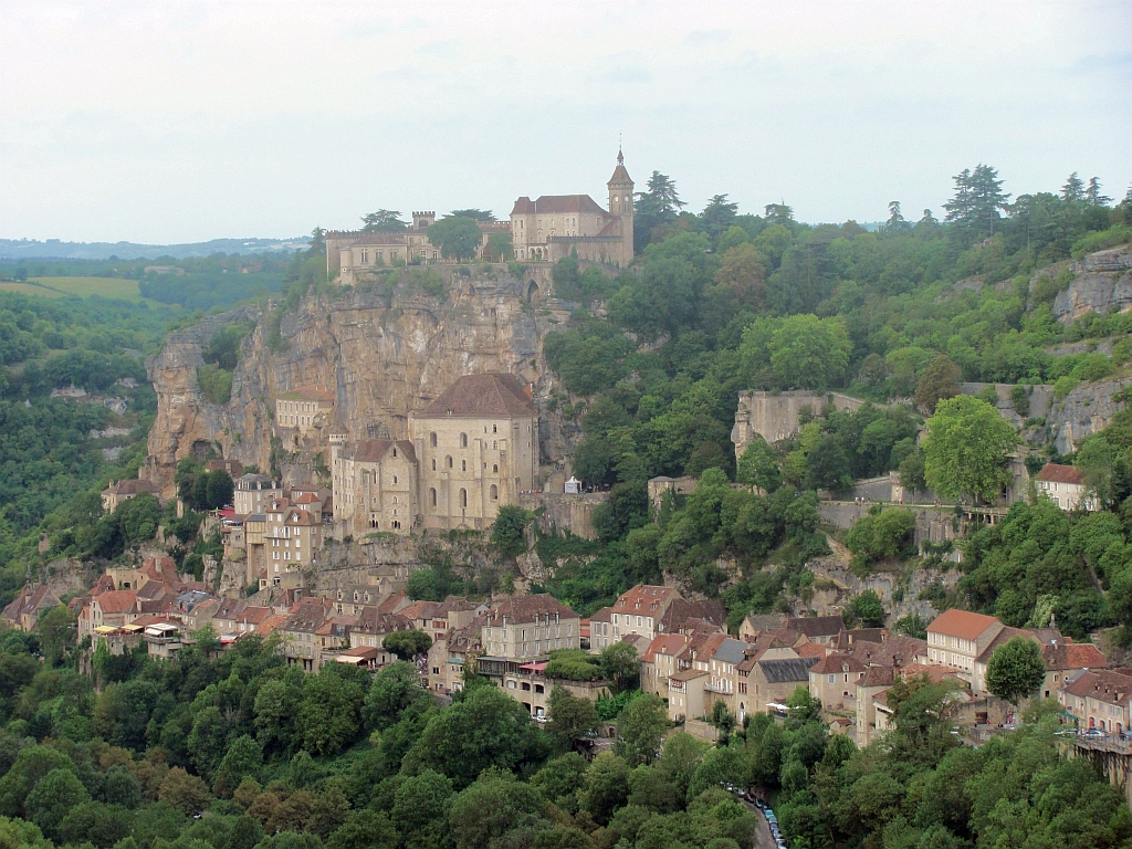 Вырвавшись из караванной тягомотины, мы быстро долетели до промежуточной цели и въехали в город Рокамадур. Сразу же на въезде толпы народа и машин, везде занятые парковки и магазины с сувенирами. Это была на самом деле еще не сама цель визита, а место, с которой на эту цель можно посмотреть. Что мы и сделали, поставив машину на обочине у какого-то недостроенного дома. Потом зашли в туринфо и там нам объяснили, что отсюда можно попасть в исторический центр Рокамадура по низу и потом подняться или верхом и потом спуститься. Мы выбрали верхний вариант. И показалось, что это было хорошо.