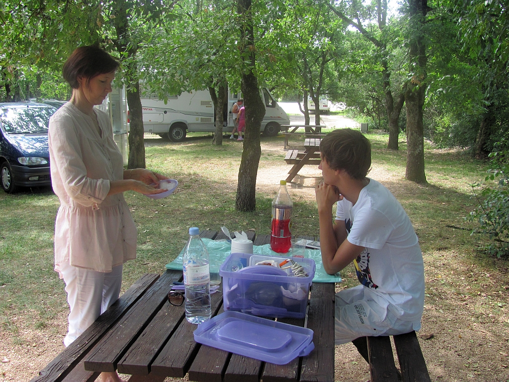На самом деле ничего особо страшного. Ну запыхались слегка, совсем слегка. И наверху, на ветерке мы решили впервые за всю поездку по её заграничной части устроить дневной перекус. У нас в багажнике уже несколько дней лежала французская круглая дыня. И вот мы на столике рядом с машиной накрыли стол. А дыня, надо сказать, оказалось ну очень вкусной, совсем не похожей на наши дыни, что-то от ананаса и еще чего-то. Цвет мякоти почти оранжевый и она очень сочная и сладкая.