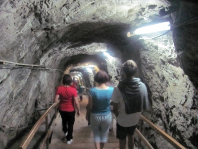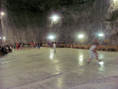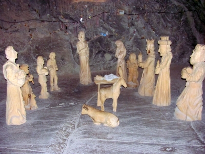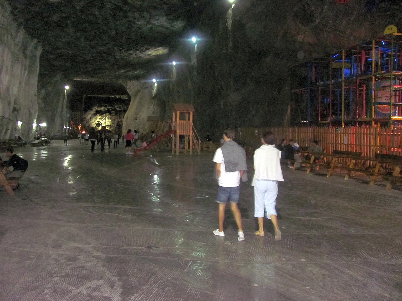 Есть даже церковь, перед входом в которую установлена группа деревянных скульптур. В общем все сделано для отдыха любого плана. Видимо, румыны (и не только они) приезжают в пещеру на целый день, оздоравливая свои легкие, наверное, полезным соленым воздухом. А иначе чего бы им тут делать :). И плата за весь день уже не кажется высокой. Это мы не могли истратить больше часа, поэтому пришлось прекратить просмотр олимпиады, а сосредоточиться на геологии.