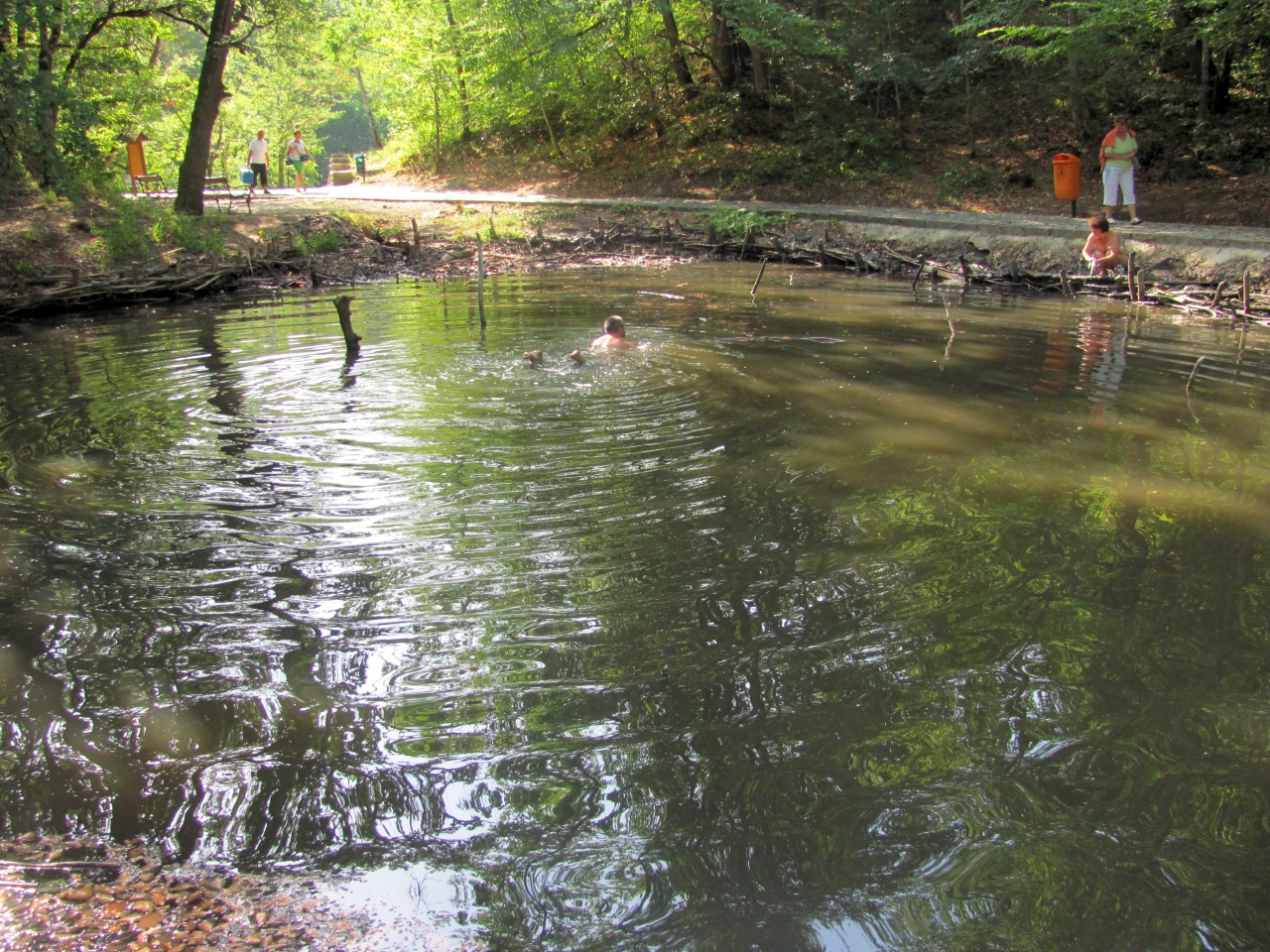 Вокруг озера парк с дорожками, которые сначала идут по берегу вдоль ограды, а потом уходят вглубь. Там мы нашли еще одну лужу с грязью, в ней плюхали несколько человек, кто-то набирал грязь в пластиковую посуду.