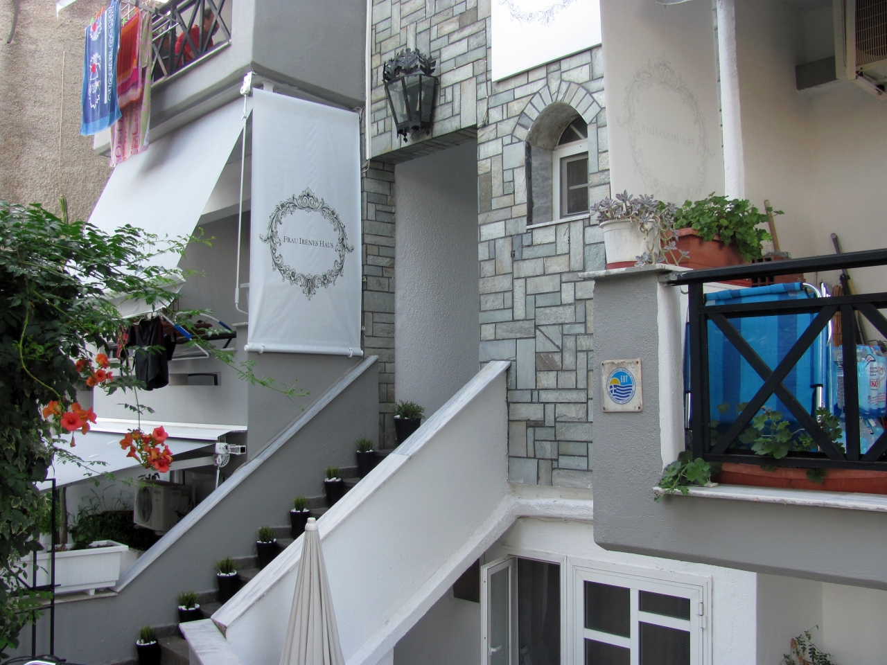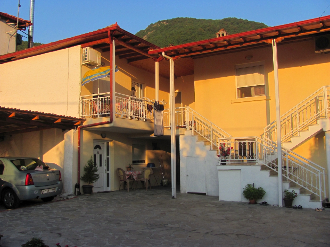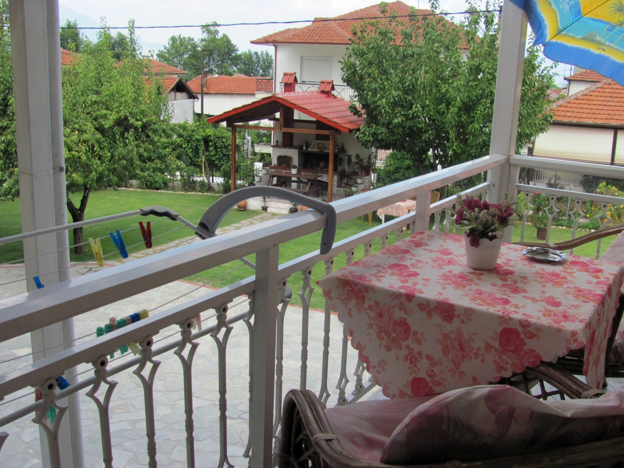 Мы как-то сразу и не заметили улыбчивую женщину, больше напоминающую внешностью украинку, чем гречанку, которая приветливо смотрела на нас. А когда заметили, то поняли, что это хозяйка. Она хоть и напоминала украинку, но могла говорить только на греческом. Естественно, что она сразу же поняла, кто мы и жестами позвала нас в наше сегодняшнее жилье. По лестнице, перед которой мы как-то естественно разулись, мы поднялись на второй этаж. Здесь нас ждал не то, чтобы сюрприз, это было просто неожиданно. Начнем с того, что мы вошли на большую лоджию со столиком под зонтом, с которой открывался великолепный вид на горы и во двор, который я уже описал. Лоджия была как бы 2-х комнатной - еще выделен уголок в восточном стиле - два низких диванчика перед столиком с пепельницей. Здесь по всему напрашивался кальян. Его, правда, не было.