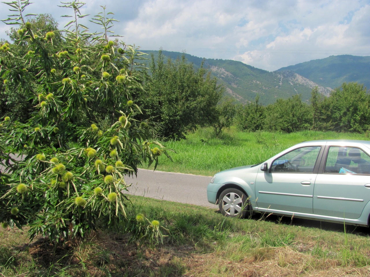 Как бы не так. Мы так и проехали все, несолоно хлебавши. Потом, уже недалеко от места назначения съехали с основной дороги вообще в сады, но это оказались ореховые рощи, и ни одного персикового дерева :(. А может, и не ореховые, но на всех деревьях было в большом количестве навешано много зеленых колючих плодов. Уже вернувшись домой я выяснил, что это рощи из каштановых деревьев. А колючие плоды - это, значит, каштаны. Судя по количеству деревьев греки потребляют каштаны в огромном количестве. Больше, чем персики.