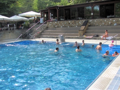 Но на стене висит указатель к еще одной купальне и мы, конечно, идем туда на разведку. Здесь все намного цивильнее - большой бассейн, рядом с ним открытое и закрытое кафе, спа-салон. Вход сюда стоит 3 евро.