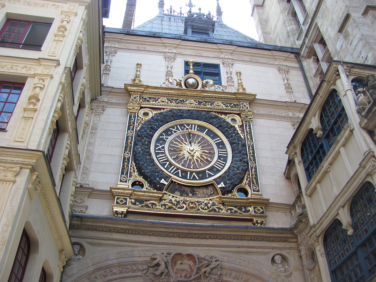 От собора мы двинулись по оживленной и какой-то праздничной пешеходной улочке к следующей достопримечательности города - к ренессансным воротам Gros-Horloge с астрономическими часами и колокольней 14-го века. Не доходя 50 метров до ворот Марина купила себе флакончик духов и это сильно подняло ее и так неплохое настроение. А еще там продавались красивые букетики, но на них мы только посмотрели, покупка была строго настрого запрещена :(. |