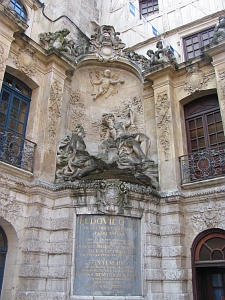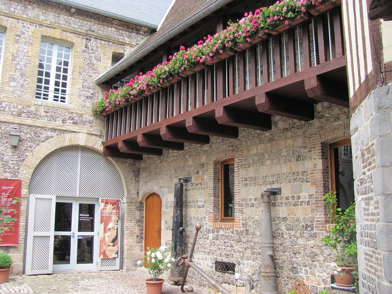 зайти в неприметные ворота, не закрыто. Зашли и попали в совершенно замечательный квадратный двор непонятного назначения, весь в тени густых деревьев. По всему внутреннему периметру этого фахверкового сооружения балкон с балюстрадой, подпертый столбиками, украшенными устрашающей и одновременно забавной деревянной резьбой. Только по приезду я узнал, что этот фахверковый дворик - бывший чумной двор Руана и в здании была местная костница - оссусарий. Здесь почти никого не было, мы уселись на лавочку, отдохнули и Марина открыла коробочку с покупкой и еще улучшила свое настроение :). Совсем не чувствовалось здесь никакого угнетения, наоборот, было хорошо и умиротворенно. |