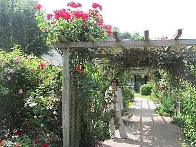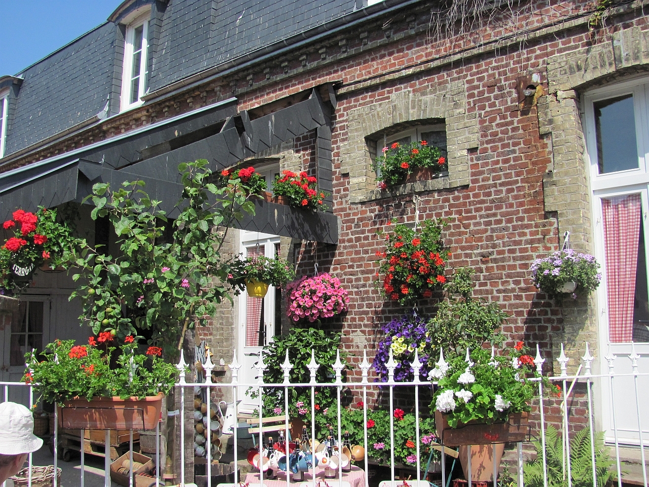 А потом мы сели в свою, уже изрядно Мы поставили машину на трассе в тени нависающих над ней деревьев, а сами пошли искать розы. Это оказалась очень колоритная и нарядная деревушка на алебастровом берегу океана, по которой просто прогуляться одно удовольствие. Еще здесь есть самая короткая река Франции (1100 м) и здесь жил Виктор Гюго. И мы с помощью фотографий так и пойдем вдоль реки от ее начала до места впадения в океан. По дороге нам действительно то и дело попадались розы, но кроме них замечательные домики, галерея картин местного художника, старинная церковь Св.Мартина XV века, у которой столбы украшены ракушками и снова розы. И морская свадьба.