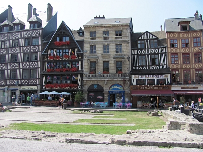 Руан понравился сразу и продолжает это делать до сих пор. Город насыщен интересными местами до предела. Несколько пешеходных зон, соборы, аббатство, удивительной красоты ворота с часами и башней. И конечно, Жанна Д'Арк. Здесь она закончила свой земной путь и на месте ее казни возведены собор и памятный крест. Кажется, что мы отвели на город меньше времени чем следовало, потому что за каждым поворотом перед нами открывались все новые и новые черты города Руан. Я уже и не говорю про изобилие фахверковых домов, обильно украшенных цветами.
