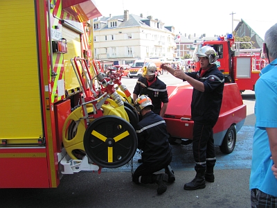 А после завтрака мы спустились вниз немного прогуляться перед поездкой и не узнали городка. Все улочки вокруг нас стали пешеходными, все во флажках, везде расставлены прилавки и на них что-то продается. Центральная площадь за церковью вся стала сплошным веселым и нарядным рынком, здесь постоянно глаза натыкались на что-то очень привлекательное, вкусное или красивое. Пришлось мне срочно мчаться за фотоаппаратом, который я забыл в номере. А на площади возле мэрии тожественный парад пожарной части и вручение наград. Как в старых французских фильмах - мэр и другие заслуженные лица с орденскими планками и трехцветными ленточками и нашивками, военные в высоких фуражках, играет оркестр, блестят начищенными касками пожарные и не менее ярко блестит хром на пожарных машинах, яркое солнце на ярком небе. Праздник во всем. Потом мы снова зашли на рынок, купили колбаску домой и большую порцию паэльи с морепродуктами на ужин, которую готовил прямо здесь и накладывал с огромного блестящего противня веселый и ловкий парень. Не могли ее не купить, потому что выглядела она очень аппетитно.