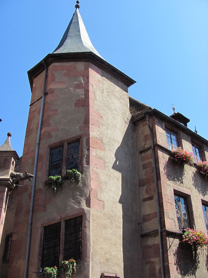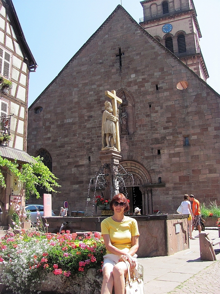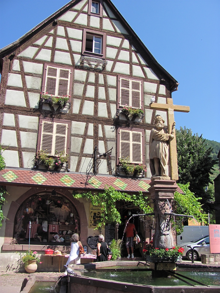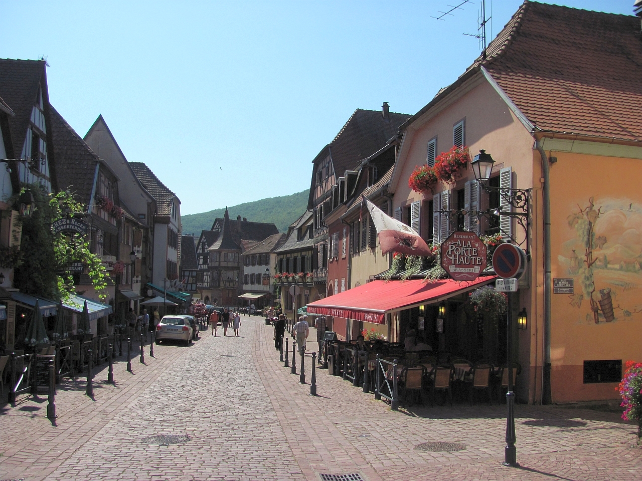 Почему-то мы поначалу как-то скептически относились к этому городку. Когда ехали, то все приговаривали - если не понравится, то поедем в проверенный Риквир и понастальгируем по 2007-му году. Тем более, что все это на расстоянии в несколько километров и мы мимо Риквира проехали. Поначалу все так и выходило - мы не могли найти исторический центр :). Навигатор нас привез на кольцо в городке и сказал, что это центр. Здесь было какое-то оживление, но было видно, что люди шли в парк каких-то детских развлечений - его было видно с кольца. Т.е. на обычное для практически любого городка воскресное времяпрепровождение. С этого кольца мы съехали в какой-то съезд и попали явно в спальный район - обычные жилые одноэтажные застройки. Вернулись, оставался, кроме обратного выезда, еще один вариант съезда, который мы не проверяли. У меня уже чуть было рука не дрогнула пропустить его и поехать на выезд. Но сделал дополнительный круг по кольцу и все же проверил и тот съезд. И вот на нем то мы и увидели начало пешеходной зоны, отгороженное шлагбаумом. Отлично. Все места парковок были помечены платными и заняты. Я немного покрутился, покрутился и свернул в тихую улочку. Она оказалось совсем тихой, потому что здесь было местное кладбище :). И как раз недалеко от его входа нашлось отличное место в тени дома с высокой крышей. Это было очень кстати, потому что становилось реально жарко. И когда мы зашли за шлагбаум, то больше обрадовались не начинающейся череде красоты (от которой, кстати, уже даже немного рябило :)), а фонтанам с холодной и, на мой взгляд, питьевой водой. Ну а потом уже почти стандартно, Эльзас есть Эльзас, а значит старинные и не очень, нарядные и очень нарядные фахверковые дома выстраиваются в улицы и улочки, перекрещиваются в еще более нарядные площади и площадки и радуют многочисленных туристов под непрерывный стрекот фотоаппаратов. Рибовилле побольше Кайзерсберга, еще более нарядный, улицы полны туристами и прилавками с местными сувенирами и продуктами. Из продуктов главное здесь вино. В основном это "Рислинг". Но еще в ходу хлебобулочные в виде разных кренделей. Купили на пробу, они оказались вкусными и солеными, что было как нельзя кстати, учитываю все ту же жару :). И так по главной улице все дальше и дальше, стараясь придерживаться теневой стороны, мы дошли до ее конца, заглядывая иногда в многочисленные ответвления и проулки. Отсюда можно было вернуться назад, а можно подняться по солнечной дороге на холм к развалинам замка 13-го века Château de Girsberg и посмотреть на городок сверху.