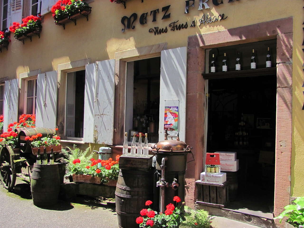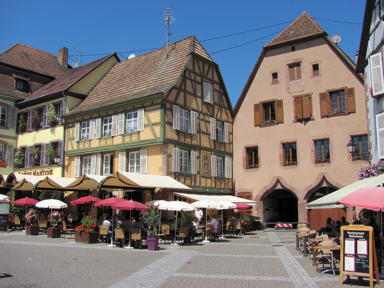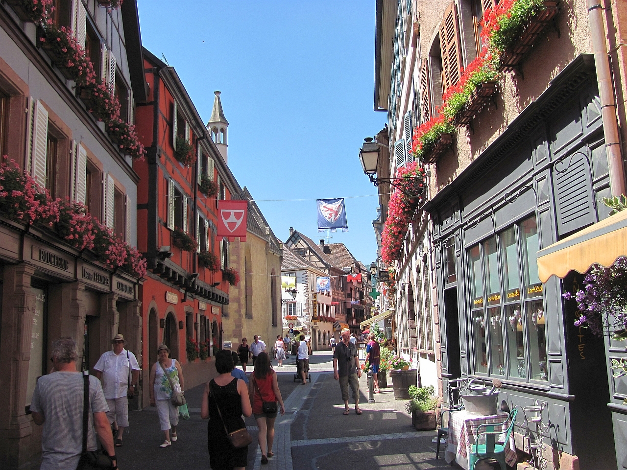 Почему-то мы поначалу как-то скептически относились к этому городку. Когда ехали, то все приговаривали - если не понравится, то поедем в проверенный Риквир и понастальгируем по 2007-му году. Тем более, что все это на расстоянии в несколько километров и мы мимо Риквира проехали. Поначалу все так и выходило - мы не могли найти исторический центр :). Навигатор нас привез на кольцо в городке и сказал, что это центр. Здесь было какое-то оживление, но было видно, что люди шли в парк каких-то детских развлечений - его было видно с кольца. Т.е. на обычное для практически любого городка воскресное времяпрепровождение. С этого кольца мы съехали в какой-то съезд и попали явно в спальный район - обычные жилые одноэтажные застройки. Вернулись, оставался, кроме обратного выезда, еще один вариант съезда, который мы не проверяли. У меня уже чуть было рука не дрогнула пропустить его и поехать на выезд. Но сделал дополнительный круг по кольцу и все же проверил и тот съезд. И вот на нем то мы и увидели начало пешеходной зоны, отгороженное шлагбаумом. Отлично. Все места парковок были помечены платными и заняты. Я немного покрутился, покрутился и свернул в тихую улочку. Она оказалось совсем тихой, потому что здесь было местное кладбище :). И как раз недалеко от его входа нашлось отличное место в тени дома с высокой крышей. Это было очень кстати, потому что становилось реально жарко. И когда мы зашли за шлагбаум, то больше обрадовались не начинающейся череде красоты (от которой, кстати, уже даже немного рябило :)), а фонтанам с холодной и, на мой взгляд, питьевой водой. Ну а потом уже почти стандартно, Эльзас есть Эльзас, а значит старинные и не очень, нарядные и очень нарядные фахверковые дома выстраиваются в улицы и улочки, перекрещиваются в еще более нарядные площади и площадки и радуют многочисленных туристов под непрерывный стрекот фотоаппаратов. Рибовилле побольше Кайзерсберга, еще более нарядный, улицы полны туристами и прилавками с местными сувенирами и продуктами. Из продуктов главное здесь вино. В основном это "Рислинг". Но еще в ходу хлебобулочные в виде разных кренделей. Купили на пробу, они оказались вкусными и солеными, что было как нельзя кстати, учитываю все ту же жару :). И так по главной улице все дальше и дальше, стараясь придерживаться теневой стороны, мы дошли до ее конца, заглядывая иногда в многочисленные ответвления и проулки. Отсюда можно было вернуться назад, а можно подняться по солнечной дороге на холм к развалинам замка 13-го века Château de Girsberg и посмотреть на городок сверху.