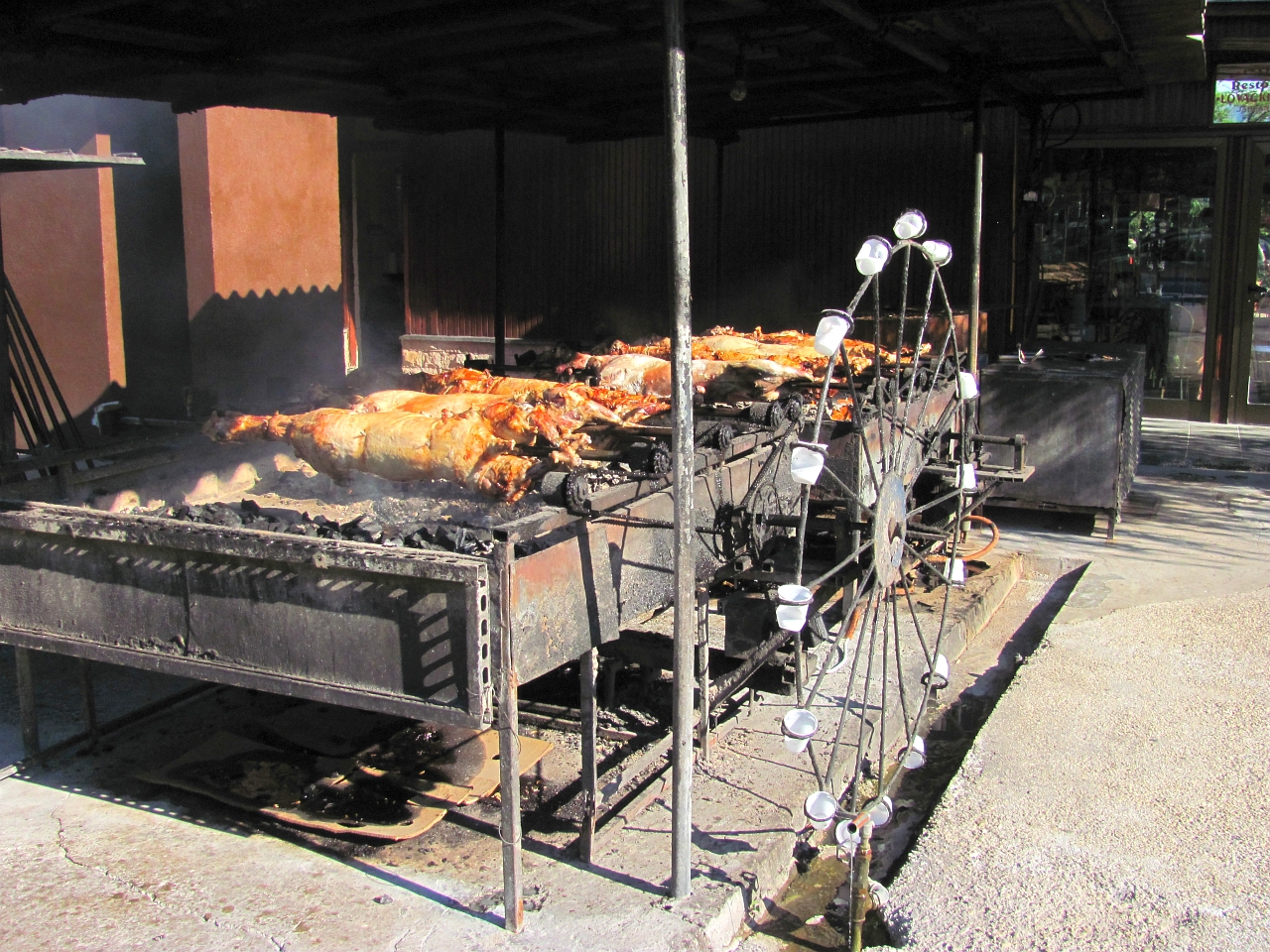 Обслуживал нас очень веселый официант, который немного пытался выдавливать из себя русские слова, все время по-приятельски хлопал меня по плечу и вообще было все здорово. Мы заказали чего-то мясного, всего было в достатке и вкусно, и домашнее красное вино хотя и было не сравнимо с пельешацким, но вполне подходило под еду.