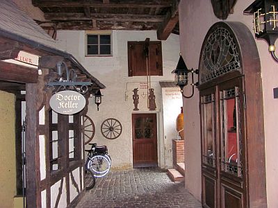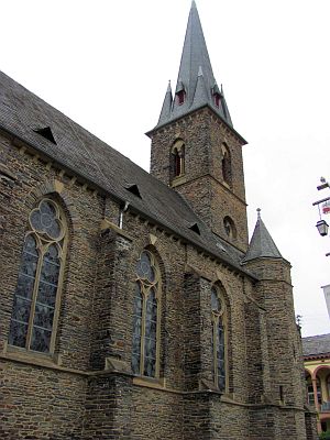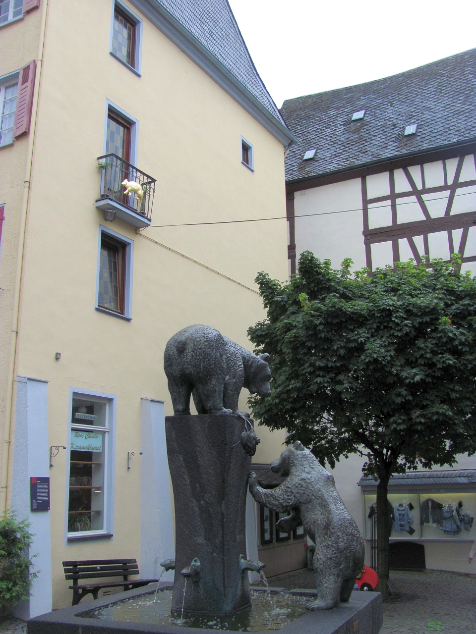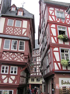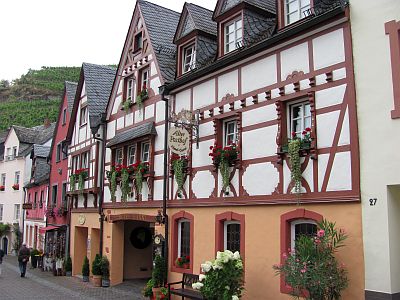 До городка Бернкастель-Кус ехать совсем ничего, километров 10. Мы только не уставали поражаться обилию виноградников на склонах по берегам Мозеля, непрерывным указателям на очередной вайнгут (винное хозяйство). Любому станет понятно, чем жив местный народ. Как и многие здешние городки, этот образован слиянием Бернакастеля с расположенной на противоположном берегу Мозеля деревней Кус. Название Бернкастелю дал замок, построенный в 6-м веке и считавшийся неприступным. Мостом Бернкастель и Кус соединили еще в 1874-м году. По этому мосту я и уехал в Кус, потому что показалось, что в нарядном Бернкастеле места для машины найти будет труднее. Кус - типично спальный район, без особых излишеств и с новыми домами. Здесь же расположен местный, довольно большой автовокзал. К нему подъезжали пассажирские автобусы с прицепами для велосипедов. Я такие видел впервые. За автовокзалом на улочках полно маленьких парковок, но на каждой табличка, что максимальное время стоянки 1 час, я проехал мимо нескольких и увидел одну, на которой таблички не было и было свободным одно парковочное место. Поставили сюда машину и пешком назад через мост в Бернкастель. В старинную часть города на центральную рыночную площадь мы попали сразу и у Марины рот открылся сильнее вчерашнего. Такого нарядного городка мы, кажется, не видели еще ни разу. Оставалось только бродить по нему и непрестанно щелкать фотоаппаратом. Кстати, точно так же как и мы, непрерывно щелкали и немцы, значит и для них тут было многое в диковинку. Очень было жалко, что вся эта нарядность несколько блекнет в виду затянутости неба облаками - погода постепенно начала портиться. |