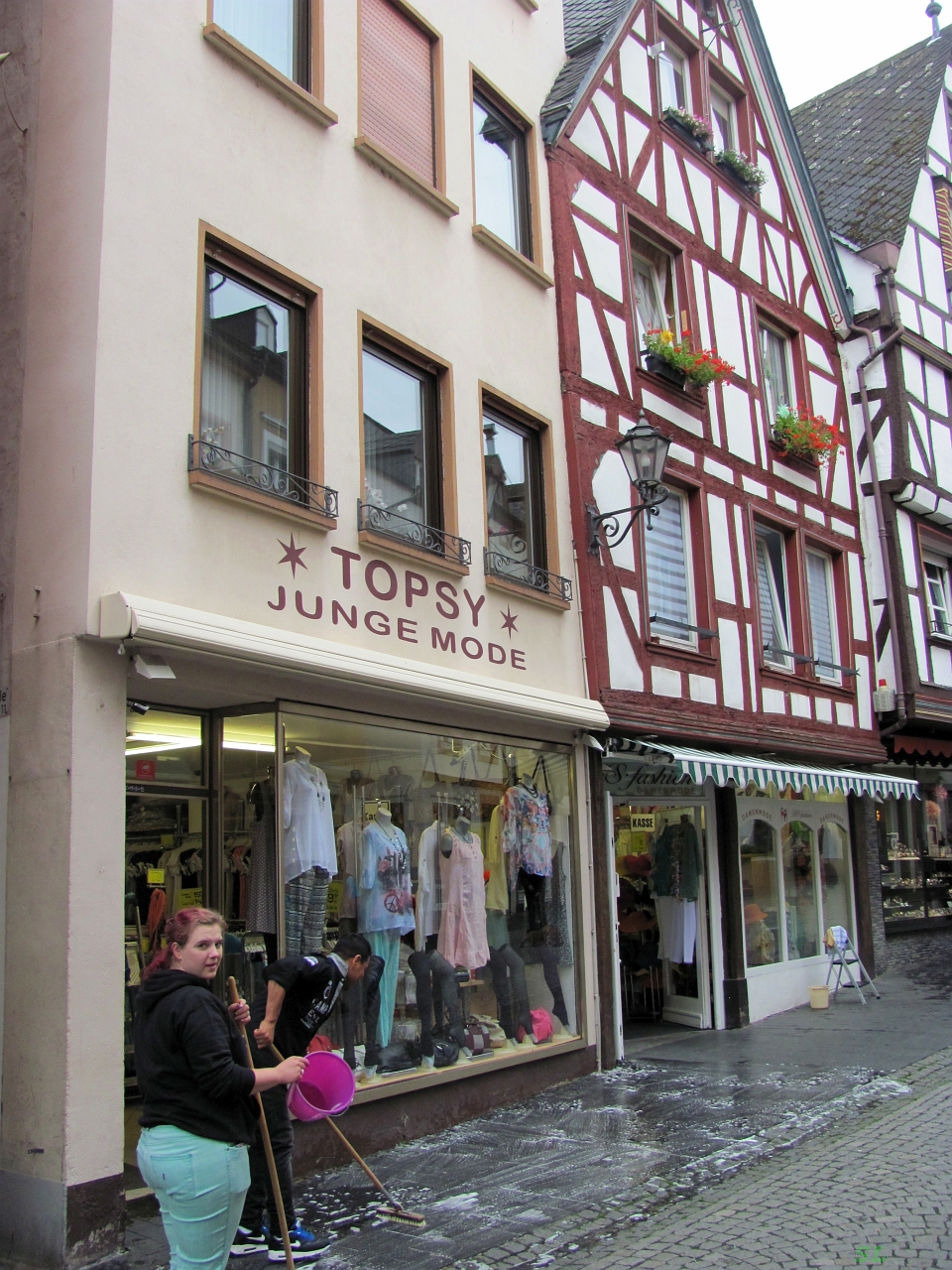 Т.е. мы приехали в Трабен-Трарбах. Я снова почему-то не поехал в более старый Трабен, перед мостом через Мозель в Трарбахе уехал вниз, на набережную Мозеля и там поставил машину на точно бесплатной и точно не ограниченной временем парковке (49.950140, 7.116848) . Мы прошлись по улочкам Трарбаха (их тут не так уж и много), Марина все еще была под впечатлением Бернкастеля и никак не воодушевлялась окружающим. Ну городок и городок... Зашли в сувенирно-винный магазинчик и я здесь увидел в продаже вино "Krȍver näcktärsch". Покупать его, конечно, сразу не стали, просто запомнили :). Кстати вино в Трабене-Трарбахе дешевле, чем в Бернкастеле, причем одноименное.