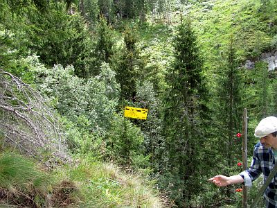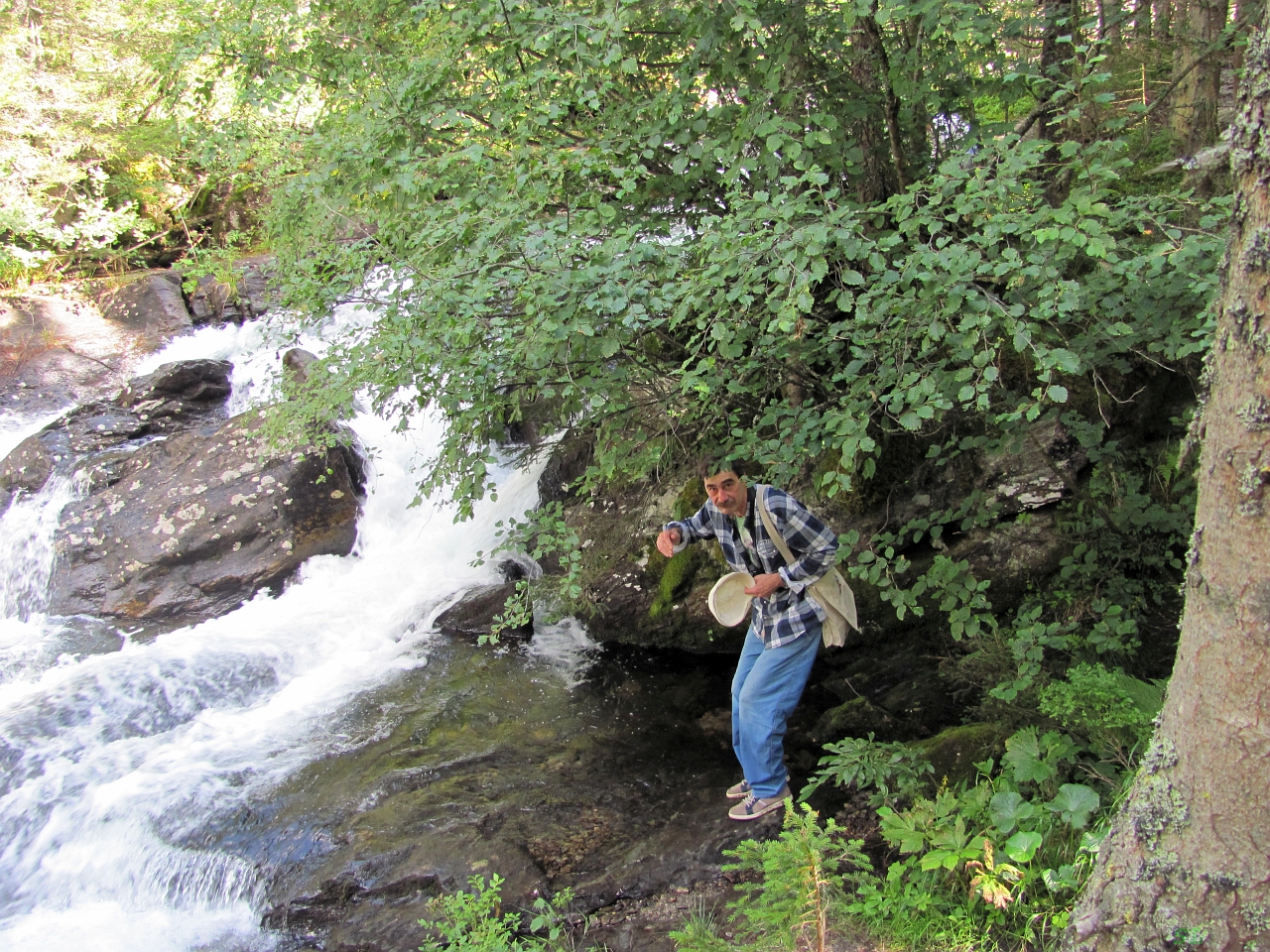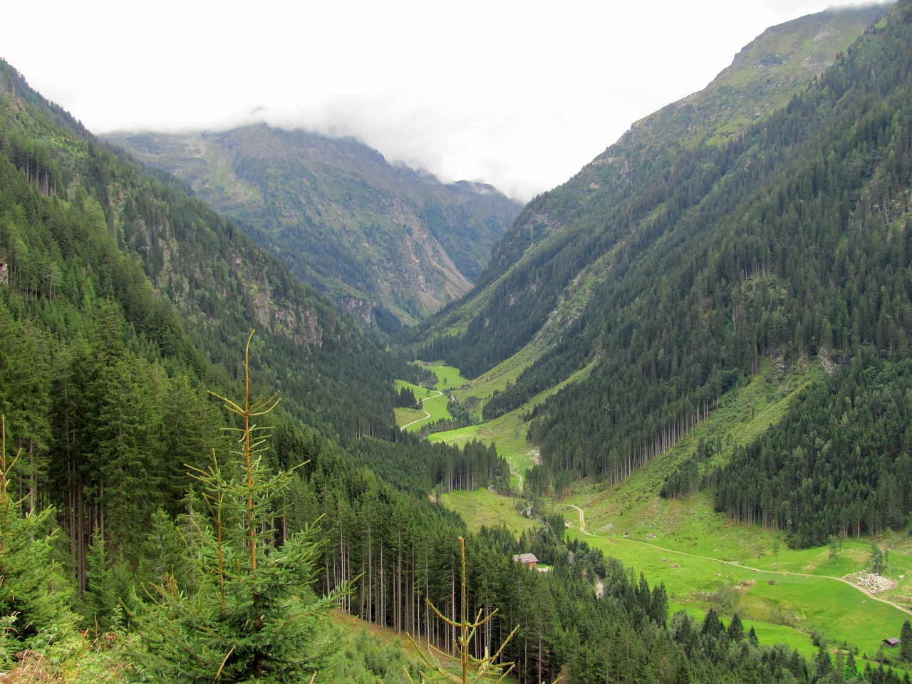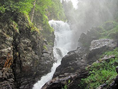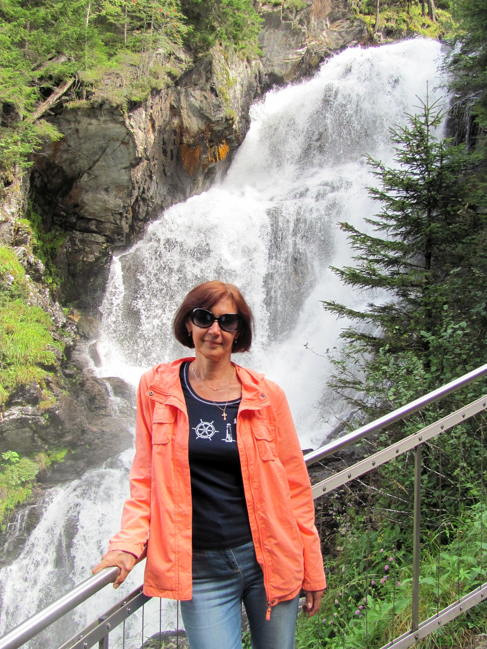 Честно говоря, нам и ждать-то их особенно не пришлось. Я успел сделать пару снимков отеля, Марина еще раз изучила схему местных достопримечательностей и вот уже и наши друзья. Поскольку у нас все заднее сиденье было завалено нашими вещами двадцатидневного накопления, решено ехать на двух машинах. То, что у Комаровых в их большом и новом автомобиле Fiat Freemont заднее сиденье пустое, мне как-то не подумалось :). Мы на своем Лёвике впереди, Фримонт с Комаровыми сзади. Навигатор прямо от отеля повез нас уверенно в горы через живописные маленькие деревеньки. Но ехать было недалеко, через 15 минут мы уже подъехали к шлагбауму с вывеской Wilde Wasser. Оказалось, что дальше проезд платный, плата берется с автомобиля, стоимость 7 евро. Тут, наконец-то, нам стало понятно, как можно сэкономить :). Николай предложил нам разместиться в его машине, а мою оставить где-нибудь перед шлагбаумом. Все согласились. Но встать прямо тут было негде, а вот метров за 300 до шлагбаума я заметил стоящий там автомобиль и решил уехать туда. Почему-то никто со мной не поехал и после того, как я успешно поставил машину там где и планировал (47.353155, 13.722366), назад к шлагбауму мне пришлось топать пешком, пока остальные меня терпеливо и заботливо дожидались :). После шлагбаума надо ехать еще с пару километров и начинается большая парковка, практически полностью забитая машинами. Мы проехали в ее конец и там нашлось отличное место. В это время мы еще не представляли себе, что это за место и как его смотреть. Одели на всякий случай куртки, все же высота около полутора километров над уровнем моря, и пошли себе по стрелкам. И оказались у конца очень полноводного водопада Riesachfälle, который красиво забрызгивал деревья и кусты, скалы и нас мелкими брызгами. Оказалось, что пешая тропа к озеру поднимается крутыми лестницами и тропами вверх вдоль водопада. Все пыхтели и лезли, лезли и пыхтели, часто останавливаясь вроде как для фотографирования, а на самом деле чтобы перевести дух. Николай на одной из таких остановок напомнил мне, что Австрия была родиной фашизма. Часто думалось, что куртка мне совсем была не нужна и хотелось от нее избавиться. Но было жалко, а вдруг мы назад пойдем другой дорогой, навстречу туристы попадались, но не так много, как их ползло вверх. То ли умирали по дороге, то ли все же есть другой путь назад. Но честно говоря, тропа была восхитительной, а потом она еще вышла к висящему над расщелиной качающемуся мосту длиной метров пятьдесят, с которого даже удавалось в процессе качания что-то сфотографировать. А затем подъем перестал быть таким крутым, водопад превратился в быструю горную реку, в которой захотелось напиться после крутых лесенок. |