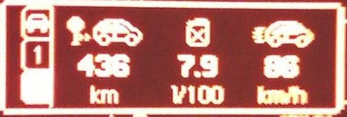Одного счетчика компьютера для замеров не хватило, пришлось задействовать второй. Разница в цифрах километража на фотографиях экрана с тем, что я написал, в 17 км объясняется тем, что я не сразу спохватился и не обнулил второй счетчик, когда он наполнился до 9999 - дальше компьютер автомобиля километраж считать не умеет.
