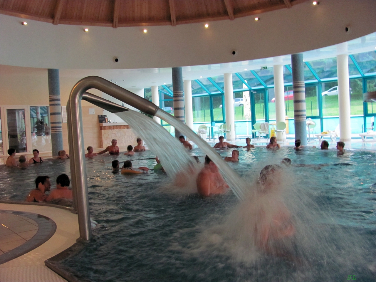 Тут все как везде. Нам выдали браслетики и простыни для сауны, дальше общая раздевалка с кабинками и цифровыми табло, на котором виден твой лимит времени и номер шкафчика. В комплексе два бассейна под крышей, один побольше с тёплой водой, разными массажными струями и глубиной, позволяющей поплавать, другой горячий, градусов 36-38, мелкий, с сиденьями и водномассажными лежаками, в которых включают струи раз в полчаса на 15 минут.