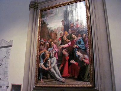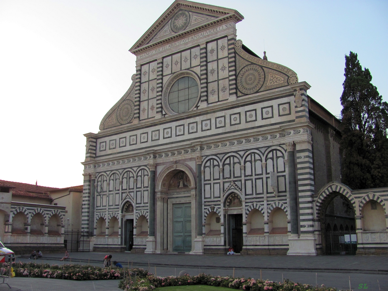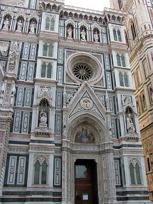 Потом мы пошли немного не туда, потом снова пошли туда и в результате как-то вдруг, примерно через час после выхода из отеля, вынырнули на краю площади Plazza di Santa Maria Novella с одноименной церковью. Ну вот оно и началось. Меня сразу очаровала эта светлая праздничная и такая непохожая на все виденные ранее архитектура. Я не буду здесь описывать известные подробности или технические характеристики этой базилики, это все сейчас можно легко найти в сети (например). Мне, неискушенному грузом историко-архитектурной подготовки достаточно слов - нравится или нет. Так вот этот вид понравился. Мы даже успели зайти внутрь и полюбоваться издалека (в церкви шла служба и бдительный охранник строго следил за туристами) на собрание всяких знаменитых чудес - фресок, памятников и распятий.... Наперед скажу, в каждой флорентийской церкви это все в таком изобилии, что теряется острота восприятия, и начинаешь смотреть на какое-нибудь распятие Джамболоньи как на само себе разумеющееся, потому что это все здесь вплетается одно в другое и очень органично. Или спокойно так проходишь в пятый раз мимо Давида Микеланджело (пусть и копии). Ну ладно, это все впереди.... А пока мы обошли базилику вокруг, вышли на вокзальную площадь, там поняли, что можно пройти к отелю и покороче, вернулись на площадь. Здесь шло выступления какого-то самодеятельного певца, тем не менее собравшего довольно большое количество зрителей. Он пел на английском языке и вполне прилично, аккомпанируя себе на гитаре. Мы тоже уселись на скамеечке, отдохнули слегка, послушали и попили холодной водички из нашей бутылочки. Некоторые зрители вставали, давали певцу денег и даже покупали у него диск с его записями. А мы просто посидели и пошли дальше. В планах не было смотреть все, так, немного прогуляться. Но как-то так потихоньку мы вышли сначала мимо капеллы Медичи с затянутой в леса башней к рынку, обогнули его и повернули почти назад к базилике Сан-Лоренцо. Она была уже закрыта и мы просто посидели на ее ступеньках и допили нашу воду. А пустую бутылку я выбросил в урну. Кстати, потом у нас базилика Сан-Лоренцо - одна из старейших и самых больших церквей Флоренции - выпала из поля зрения и мы так в нее и не зашли и это прискорбно. Базилика внутри буквально нашпигована произведениями искусства, в том числе там можно увидеть надгробия Медичи работы Микеланджело. Не увидели.... В этом кроется минус предварительных осмотров. А от Сан Лоренцо нас, конечно же, буквально притянул к себе величественный собор Santa Maria del Fiore. Это, наверное, самое знаковое сооружение города, но я этого еще тогда не знал и, когда мы вышли на площадь перед собором, то я даже несколько остолбенел. Не было тогда, нет и сейчас у меня слов для того, чтобы описать это чудесное творение человеческих рук. У собора, на мой взгляд, есть только один недостаток - площадь вокруг для него слишком мала и собор невозможно поймать в объектив фотоаппарат целиком. Поэтому мы, да и все остальные, просто кружат вокруг него и фотографируют его по частям. Как будто эти части потом можно будет склеить.