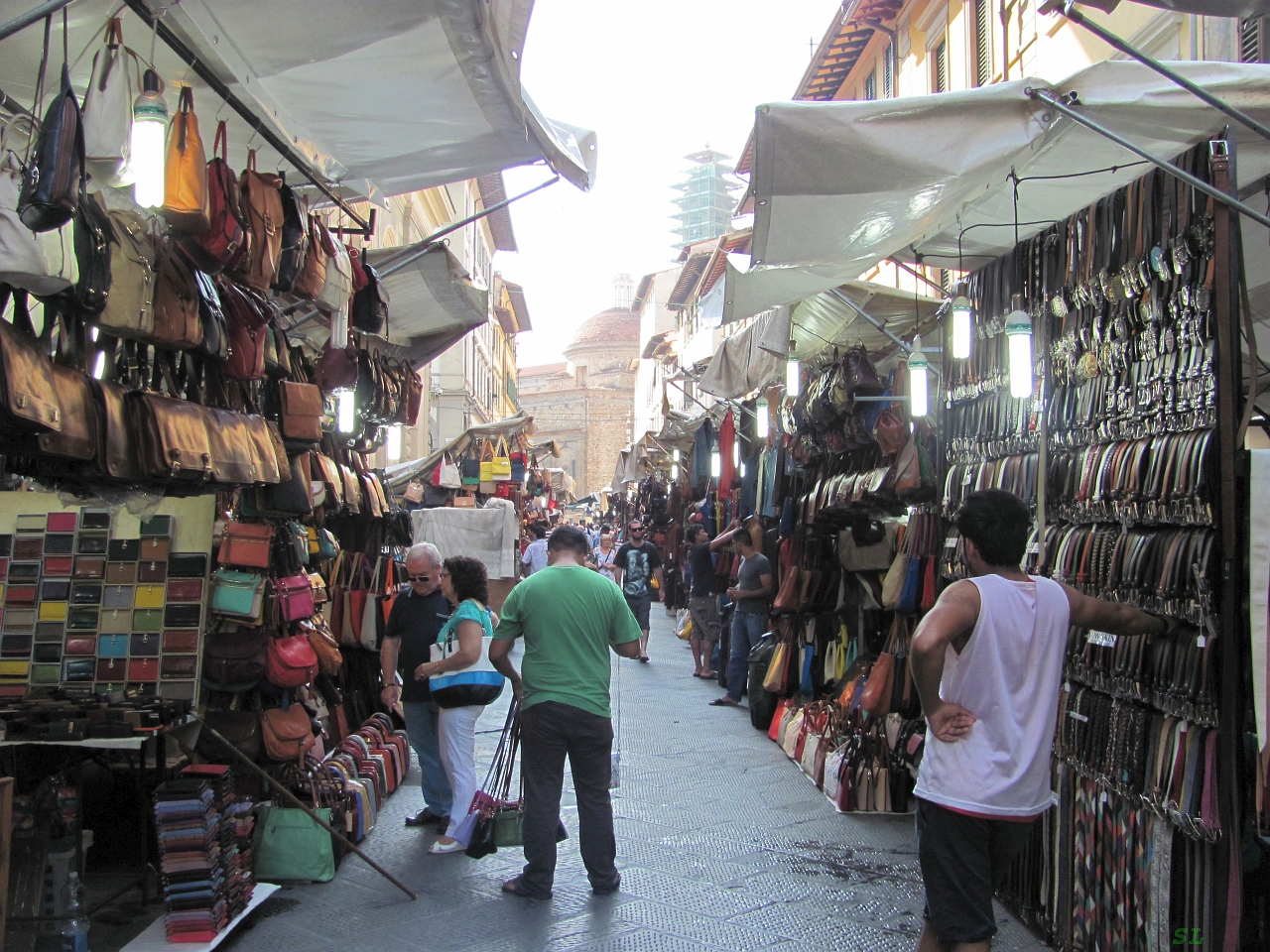 А потом нам некуда было деться, кроме как по прямой улице Via dei Servi топать с сердцу города - к собору Santa Maria del Fiore, потому что он манил своим светом. Ну не зря было потрачено почти 600 лет (1296-1887) на его строительство. И снова фото-сессия, снова мозаика из разных частей этого грандиозного сооружения, только уже при дневном свете. Ну не влезает он весь в мой маленький фотоаппарат. А что делать? Можно еще было, выстояв длинную очередь, попытаться подняться под купол собора, но времени на это у нас сегодня не было отведено. Центральный вход в баптистерий Сан-Джованни напротив собора весь затянут лесами и строительными ширмами, вход закрыт и нам были доступны для лицезрения только ворота его парадного входа и часть внутреннего убранства через щель между створками. Перед воротами толкалась куча японцев, китайцев и корейцев с разными гаджетами и все они сосредоточенно общелкивали ими золоченые ворота баптистерия (Врата Рая). И я тоже все это поделал, потом мы отошли от собора на максимально возможное расстояние и я попытался получить хоть какую-то его общую панораму. Потом повернулись к нему спиной и по улице Via dei Galzaiuoli двинулись в сторону площади Синьории, не забывая по пути заглядывать в перпендикулярные улочки и параллельные магазинчики. Справа промелькнула площадь Республики, мы на нее еще сегодня попадем, а пока мимо.