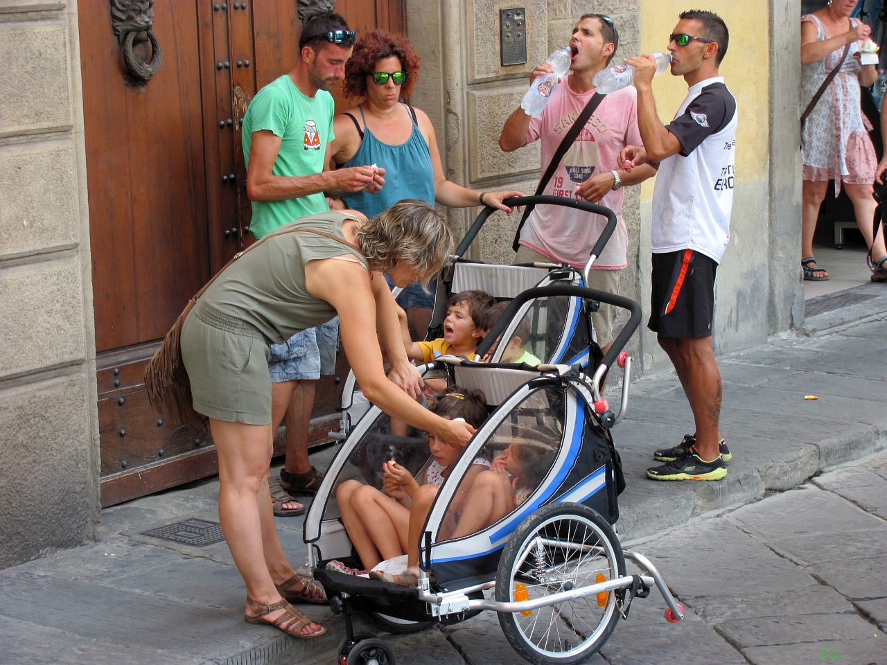 Затем мы просто немного прошлись по кварталам на этом берегу Арно, поели мороженого в маленькой кафешке Gelateria La Carraia, которая судя по всему пользовалась самой большой популярностью - задолго мы начали замечать людей с мороженым, там стояли в очереди и потом с трудом смогли усесться внутри. Но зато мороженое здесь было самым дешевым из всего, что мы видели по нашему пути и при этом очень вкусным. Это было вот здесь - рекомендую. Флорентийское мороженое - это то, что обязательно надо съесть в этом городе. Честно говоря, глаза завидущие и мы взяли порции немного бОльшие, чем требовалось и наелись, хотя ни капелечки не оставили. Пришлось еще покупать минералку, чтобы запить сладость. Небо постепенно начало хмуриться. солнце пропадать и жара снижаться. Даже стало погромыхивать, но пока всухую. Мы перешли в центральную часть по мосту Санта Тринита и снова устремились к центру, на этот раз через Палаццо Строцци к площади Республики. И в последний раз посмотрев на грандиозный Санта Мария дель Фьор, мы потопали к своему отелю. На этом культурная программа была завершена. Да, по дороге еще успели завернуть к рынку и все же купили Марине кошелек, а старшему сыну бумажник на память о Флоренции. Ну и на итальянскую еду посмотрели :).