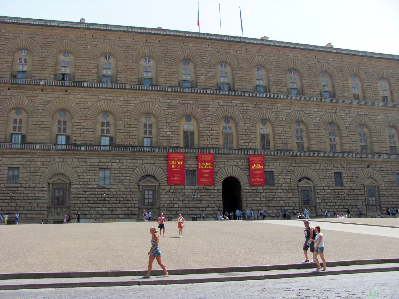 Ну а нам надо следовать к следующей цели - палаццо Питти ( Palazzo Pitti). В силу обстоятельств мы не пошли прямо к дворцу по залитой полуденным солнцем улице Via de' Guicciardin, а нырнули в кварталы и двигались по их узким и извилистым улочкам по довольно причудливому маршруту, но тем не менее вышли прямо на дворец и нам осталось только преодолеть его пустую площадь. |