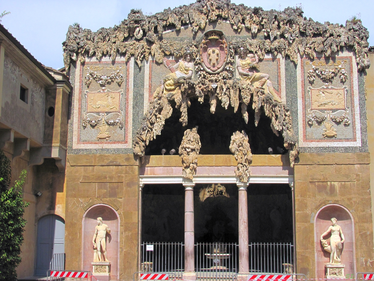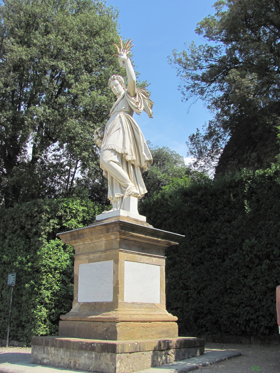 Пустую, потому что весь народ жался к стенам дворца. Прижались и мы и по тени, в которой было не особо прохладно, но хотя бы не жгло сверху, дошли до касс и купили билеты в самой простой комбинации - сады Boboli и три или четыре музея за 20 евро. Мы не хотели в музеи, питали надежды отдохнуть от жары в прохладе садов. Но почему-то отдельно купить сады было нельзя, только с довесками. Но все получилось не так, как раз в музеях и было хорошо. Сады Боболи - это совсем не то, что нам представлялось. Да, от них открывается панорамный вид на центр города. Но прибитые солнцем деревья давали совсем мало тени, пожухлая трава, выключенные фонтаны. Посетители, прижимаясь к одной стороне кустарника, тяжело и с отдыхом поднимались вверх по лестнице мимо Нептуна с трезубцем и потом долго отдыхали на траве под деревьями сверху. Цветники и клумбы не вызывали энтузиазма, поскольку им явно не хватало воды. Зато радовал фонтанчик поилки, вокруг которой постоянно кто-то толкался. Зато в первом музее - фарфора, мы получили облегчение, несмотря на то, что в нем не было кондиционеров. Но была тень, распахнутые окна и сквозняк, на котором удавалось немного остыть. Но недостаточно и после осмотра музея опять пришлось припасть к фонтанчику. Тем не менее мы постарались осмотреть все, что было отмечено на схеме садов к осмотру. И в том числе зафиксировали лучший вид на Флоренцию. Дольше всего мы искали грот Buontalenti, кружили, кружили по солнечным аллейкам, удалось даже поесть местных яблочек, но потом нашли. И как бонус к гроту натолкнулись на местную маст си - гнома Морганте или маленького Бахуса. Бонус бонусом, но к концу осмотра садов я уже больше всего думал про что-нибудь холодное. И в осмотренных потом музеях наибольшее удовольствие получал, когда удавалось остановиться в потоках воздуха от расставленных тут и там напольных кондиционеров :). Марина визуально держалась лучше меня, возле кондиционеров почти не задерживалась, и живо интересовалась всем содержимым музеев. Собственно на этом и закончилось наше посещение палаццо Питти.