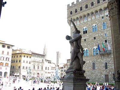 И вот наконец мы у второго сердца города - на площади Синьории (Piazza della Signoria) - уникальное собрание самых известных скульптур. И неважно, что почти все из них, кроме Персея с головой медузы копии, от этого площадь ничего не теряет. Не уменьшается от этого здесь и количество туристов, народа примерно одинаково на площади и возле собора Цветка Св.Марии (так переводится на русский Santa Maria del Fiore). Т.е. столько, что выбрать момент для фотографирования без окружающих невозможно. Всегда кто-то еще есть в кадре. Через внутренний дворик дворца Палаццо Веккьо мы пошли в сторону площади Piazza di Santa Croce с очередным флорентийским чудом - одноименной церковью Basilica di Santa Croce (церковь Св.Креста), строительство которой началось одновременно с собором Santa Maria del Fiore. Очень светлая, но сегодня одновременно очень жаркая площадь, но мы стоически прошли через ее середину к входу в базилику. Но здесь нас ждало небольшое разочарование - церковь была закрыта для посещения в связи с воскресной службой и будет открыта только через два часа. Это было грустно, поскольку внутри мы могли бы увидеть очень многое, например гробницы Галилео Галилея, Никколо Макиавелли, Микеланджело, Джоаккино Россини, композитора Огинского, Энрико Ферми и многих других. Кроме того, мы не увидели фресок и скульптур работы Джотто и других знаменитых художников и скульпторов. Когда мы планировали поездку, то как то не взялось во внимание, что в воскресенье мы не сможем попасть до обеда во многие храмы из-за служб. А теперь перепланировать маршрут и день уже было поздно. Но и того, что мы увидели во Флоренции, нам было в принципе достаточно. Уже сейчас, а нас еще ждали следующие открытия и испытания. Попытались обойти базилику вокруг, но уткнулись в саду сзади нее в глухую стену и пришлось вернуться назад. Следующий наш объект - это набережная реки Арно. по которой планировалось дойти до очередного маст си - моста Ponte Vecchio (Понте Веккьо - Старый Мост). Но набережная была настолько залита солнцем, что нам удалось пройти по ней только до того места, где закончилась тень и до моста еще было метров триста (его уже было хорошо видно), но идти так дальше не получилось. Пришлось уйти в тень боковых улочек, которые нас увели своей относительной прохладой обратно к площади Синьории. Но это было и хорошо и даже удачно, поскольку мы почти совсем не осмотрели на ней известную Лоджию Ланци - не пробились через толпу желающих, ну и нам еще надо было хоть снаружи познакомиться с галереей Уфици. Сейчас толпа почти рассосалась, пройти внутрь Лоджии удалось практически сходу. Перед входом висит табличка, что находиться внутри можно не более получаса или около того.