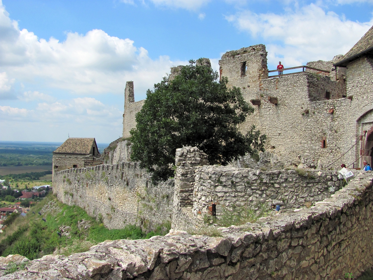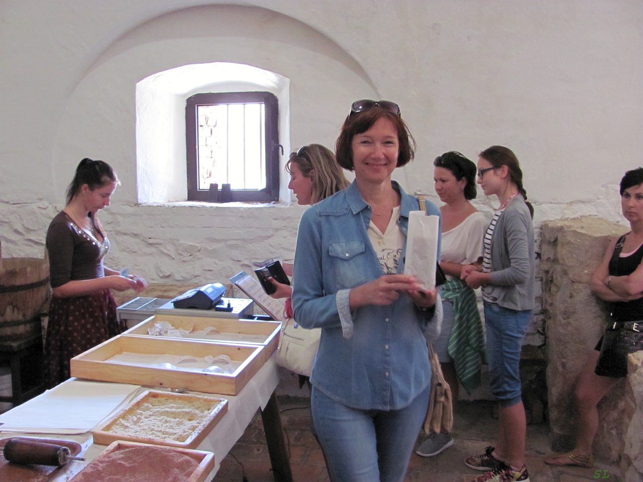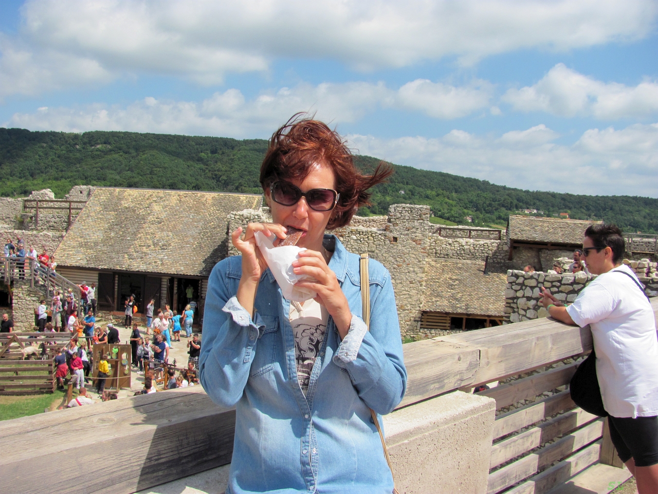 В четвертый день с утра было довольно прохладно, продолжал дуть ветер, небо в облаках, но они не дождевые. На балконе залило доверху кадки с кипарисами (значит можно уже их не поливать), один из них повалило, но вроде без больших повреждений, я его просто поставил, а землю с пола собрали. Погода самая прогулочная и мы поехали в Шюмег, чтобы познакомиться с местным замком. Поехали на машине, потому что на 30 км мы пока не решались выдвинуться на велосипедах, а вдруг выдохнемся. Тем более, что после обеда нам надо было уже быть в озере, не пропадать же дню релакса и оплаченным заранее часам. На машине ехать совсем недалеко, только разогнался, как уже и холм с замком над нами. Тут мы не стали осторожничать и поехали прямо по указателям на замок, не обращая внимания на узость улочек, и нам удалось бесплатно поставить машину прямо у подножия замка в конце (или в начале) пешеходной торговой туристической улочки. Вот здесь, место как раз было одно именно для нашего автомобиля в тени большого дерева. В замок надо подниматься по дорожке, огибающей холм, которая в конце упирается в замковые ворота, в которых вместо привратника сидит кассир. За два билета с нас взяли 4000 форинтов, хотя на сайте у них указана цена в 1500 форинтов за один билет, видимо, какая-нибудь наценка выходного дня :). Кассир сидит за окошком и не видит всех входящих, но дальше поток туристов рассекает внушительная фигура мужика в кожаных латах, да еще и с копьем. Бдит, чтобы кто-нибудь зайцем не просочился. Честно сказать, надбавка в цене была отработана полностью. В первом же помещении всех встречала девушка, танцующая с факелами в разных сочетаниях и пришлось с полчасика подивиться на ее представление, потом, не успели мы обойти замок по стене, как внизу, в замковом дворе команда лучников затеяла соревнования по стрельбе из луков. Честно говоря, впечатляло. как они умудрялись попасть в цель метров со ста при сегодняшнем сильном боковом ветре. Но попадали. Или вдруг в какой-то комнате в восточном стиле начинала исполнять танец живота другая симпатичная девушка. В общем нас старались развлечь, как могли. Да еще и подобием чешских трдельников накормили, правда, это уже за отдельные деньги. А я и не знал, что у венгров в старину тоже делалась такая выпечка, хотя это, возможно, что и плагиат. Но вкусно. Конечно, в крепости был и птичий двор с птичками и зайчиками, лошадками и осликами. Теперь немного про саму крепость. Место, где она расположена, было стратегически очень важно - здесь пересекались транспортные пути (вспомните - ведь и мы со Штурманом не смогли не проехать мимо :)). Поэтому еще в XI-м веке здесь на холме во время правления короля Иштвана Святого и была выстроена эта крепость. Потом она укреплялась и модернизировалась и оказалось, что она выстроена настолько удачно, что никто из врагов ее взять не могли. Не смогли татаро-монголы в 13-м веке, потом не смогли турки, хотя с 14-го по 16-й век в течение 150 лет они осаждали ее не один раз. И только австрийцы (Габсбурги) после подавления восстания венгров под предводительством Ференца Ракоци взорвали стены крепости, впрочем, как и стены многих других венгерских крепостей. Но многие сооружения крепости сохранились в первозданном виде, к тому же в прошлом веке здесь были выполнены большие реставрационные работы. И это теперь самая старинная крепость в 