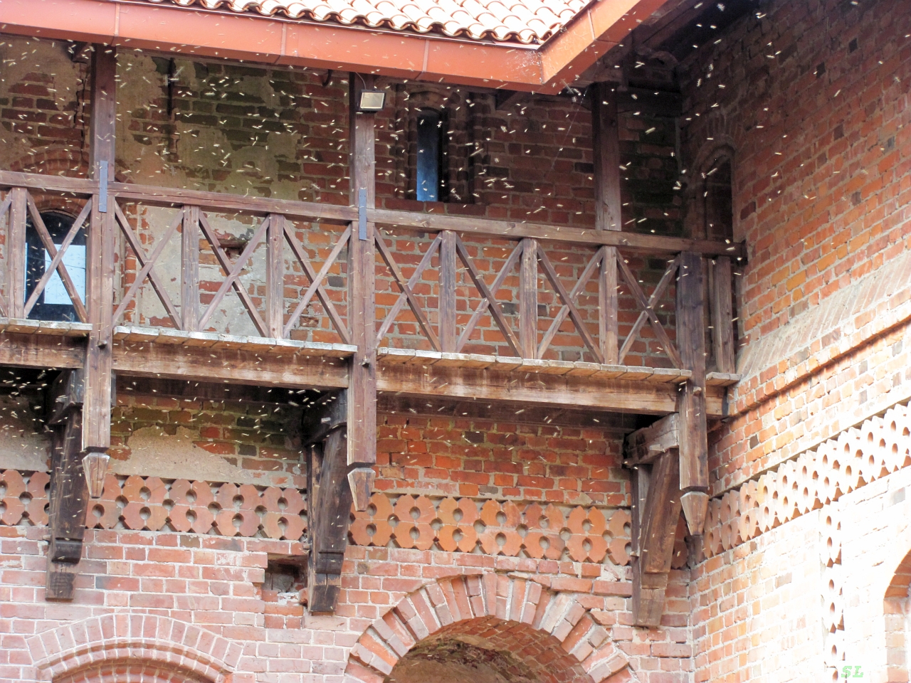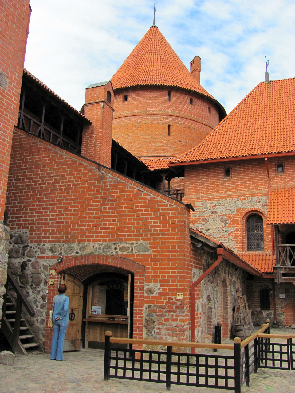 Тракайский замок довлеет над всем окружающим, несмотря на то, что он не горе, а на острове и не возвышается над местностью. Но все равно, все здесь вокруг него, он центр местной вселенной. Не считая многочисленных кафешек - кибинарен по всему берегу озера, которые кружат свой хоровод вокруг замка и озера. Свою историю замок, как и многое в Литве, начинает от Гедимина, который решил здесь построить укрепление и перенести сюда столицу. Замок в Тракае был построен уже во второй половине 14-го века, но потом разрушен и построен новый, на острове. Это случилось в 15-м веке. Замок был расположен так удачно, что никто не смог его взять за всю его историю. Кроме самой истории, поскольку замок постепенно ушел с основных ее дорог и стал никому не нужен. Сначала в нем была тюрьма, а потом, после войны с Московией в 17-м веке замок был заброшен и стал разрушаться. И только в 20-м веке его стали постепенно восстанавливать и в 1987-м году ему был придан нынешний вид как реконструкция былого. Замковый остров соединяется с сушей длинным мостом с деревянным настилом, по нему к замку тянутся туристы. Сначала их было немного, но прямо перед нами подъехал школьный автобус и из него высыпала толпа галдящих маленьких литовских школьников и мы, чтобы не оглохнуть, слегка подотстали и пошли сначала не в замок. а на прогулку по острову вокруг него. Здесь было очень хорошо, чисто и тихо. А потом настала очередь самого замка. На ценнике в кассе были указаны разные стоимости билетов для посещения, для пенсионеров скидки. У нас не было с собой документов, подтверждающих наш пенсионный статус, но я взял и спросил - мы же вот пенсионеры. И кассирша, улыбнувшись, выдала нам пенсионные билеты. Оплату можно делать картой, за два билета мы заплатили 6 евро, что ровно в 2 раза меньше обычной стоимости. Бывают и в пенсии приятные моменты :). За фотографирование внутри надо было платить отдельно, я не стал. Собственно, никто внутри и не следил особо за фотографами :). В замке несколько различных музеев, мы постарались найти и посетить их все, хотя некоторые прятались за прикрытыми незаметными дверями. Это музей здешнего быта, посуды и неожиданная большая экспозиция разных курительных трубок и фамильных печатей. Но больше всего запомнился вдруг поднявшийся с громким гулом большой рой пчел во дворе замкового дворца. Его видно на двух средних фотографиях. Служительница нам пожаловалась, что вот уже несколько лет они борются с пчелами, но безуспешно. Из-за пчел мы не стали подниматься на главную башню замкового дворца - служащая нас отговорила - они там летают на лестнице и кусаются, а оно вам надо? Вдруг у вас аллергия на наших пчел. Нам было не надо и на аллергию мы не рискнули провериться. После замка прошлись по поселку до видневшегося вдали костела Пресвятой Девы Марии, мимо еще одной достопримечательности - часовенного столба Св. Иоанна Непомука и по отличной дорожке, проходящей по берегу озера около остатков старой крепости вернулись назад к исходной точке - к нашей кибинарнице. Кибинаи - традиционная еда караимов. Это малочисленный в настоящее время народ в Крыму, имеющий татарские корни и при этом исповедающий иудаизм, но не в чистом виде, а в виде своей секты - караизм. В 14-м веке то ли насильно литовским князем Витовтом, то ли самостоятельно, но привлеченные его посулами, несколько сотен кар