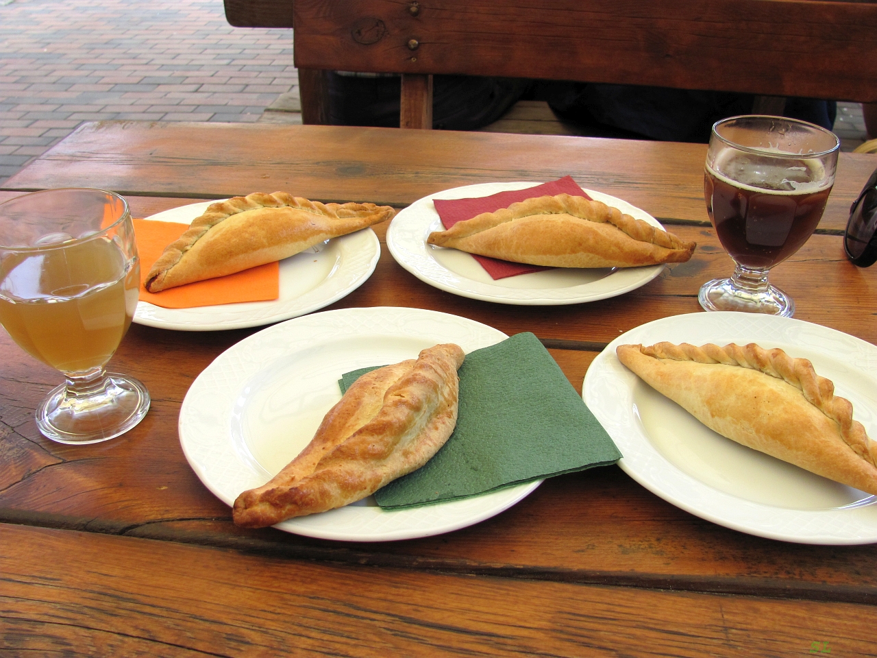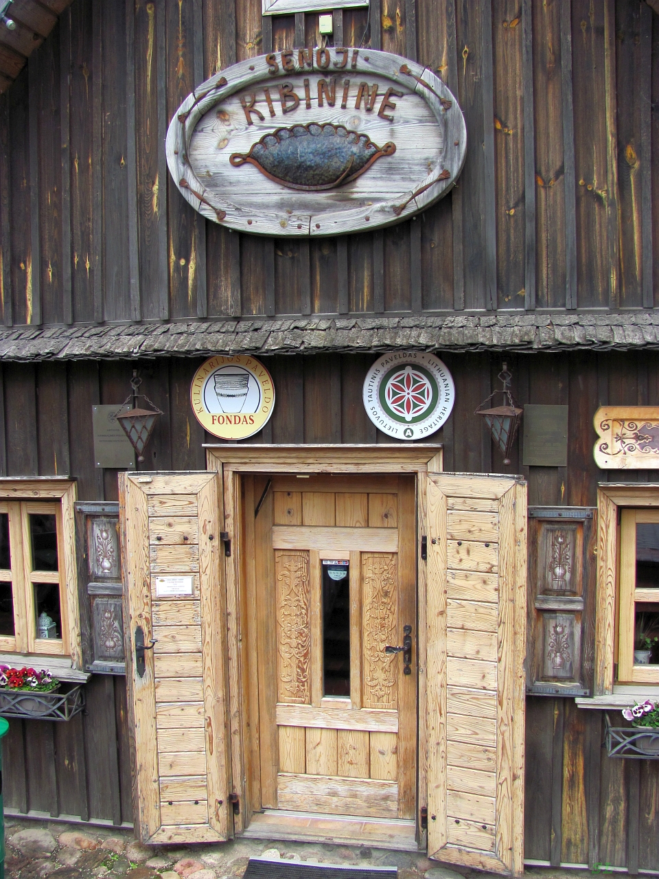 Внутри ресторанчик выглядит очень колоритно и приятно. Но почему-то здесь ни одного посетителя, все стадно за столами во дворике. Посетителей здесь довольно много, мы походили по двору, отыскивая себе свободный столик. Но обслуживают очень быстро, ждать не пришлось, только уселись, как сразу подбежала официантка. Пока мы изучали историю караимов и искали столик, на небе собрались какие-то тучки и как только сделали заказ хлынул довольно приличный ливень, такой, что брызги долетали даже до нас (мы сидели под навесом). Но намокнуть не получилось. Что такое кибинаи, мы уже поняли и на пробу заказали 4 штуки разных, три с разным мясом, а одну с сыром. Запивать их решили квасом (надо же когда-то попробовать литовский хваленый квас и яблочным напитком с тмином "Caraway (получается Каравай)" - его нам посоветовал Рамунас. Пирожки принесли минут через 15, как раз дождь утих, хотя совсем он не прекратился. Мне кибинаи понравились, песочное тесто и очень сочная начинка. И яблочный напиток тоже хорош, бодрящий и как ни странно, отлично сочетающийся с кибинаями, а вот квас не моего вкуса, слишком сладкий, поэтому он достался Марине :). Как-то так вышло, что мы съели только три пирожка, а четвертый остался нам на ужин (вот и ужин готов :)). А после дегустации я под слепым редким дождем через солнышко сходил за машиной, подобрал Марину с пирожком и мы поехали дальше - в Бирштонас, сытые и довольные. И дождь прекратился.