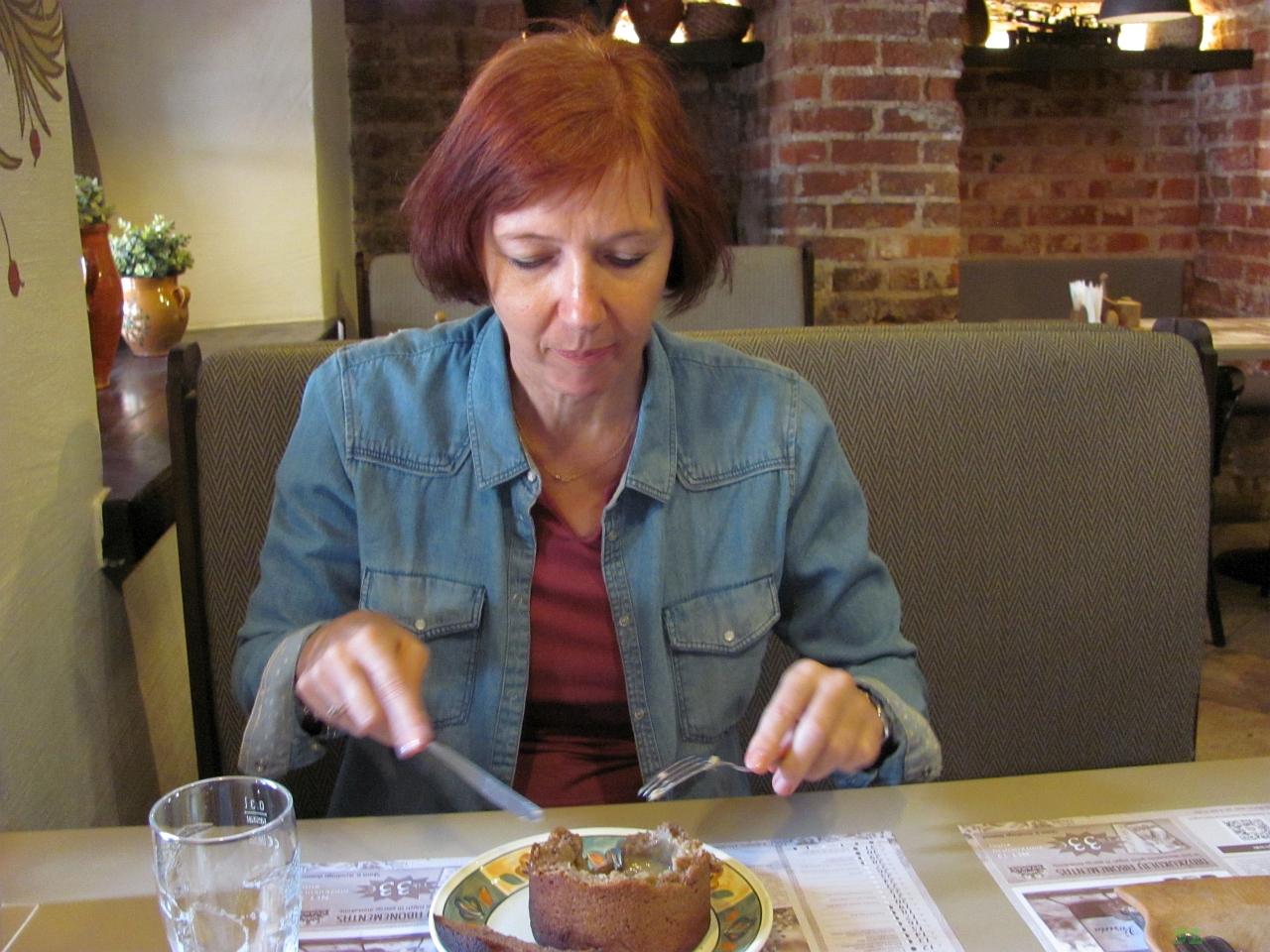 Настала пора ужина, про него мне стало думаться все с большим интересом. Мы в Вильнюсе не стали есть в рекомендуемом многими ресторане Forto Dvaras, только выпили там пива несколько неожиданно для себя. Поэтому, когда на ратушной площади мы увидели такой ресторан, то практически не сомневаясь, завернули в него. Что хочу сказать, здесь нам еда понравилась. Пиво Svyturys мы закусывали жареными колечками лука, наконец-то попробовали суп в хлебе (один на двоих, причем Марина практически не оставила от хлеба ни кусочка). На второе мы решили взять аналог белорусских драников - здесь они назывались просто картофельными блинами. Вкусные. Общий счет ужина 20 евро с чаевыми. |