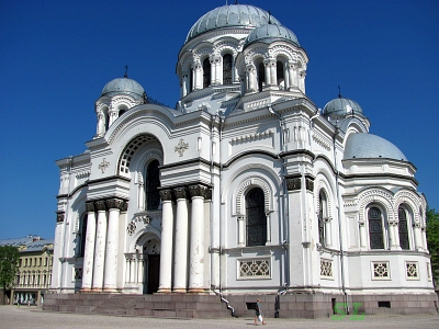 А потом, избыточно сытые, тронулись в город - у нас в наличии один световой день на то, чтобы попытаться его понять. Для этого у нас с собой была карта Каунаса, взятая по традиции на стойке отеля. И одно из первых из культовых сооружений, что нам встретилось - мечеть в соседнем парке. Отель оказался недалеко от центра, если центром считать Лайсвес аллею. Мы вышли к ней уже через полкилометра на площадь Независимости к церкви Святого Михаила Архангела. Массивная церковь в византийском стиле была построена не очень давно, в самом конце 19-го века для местного гарнизона. Была православной до 1990-го года, а потом, побыв немного музеем, передана римско-католической церкви. Внутри церковь очень аскетична, запомнилась картинами, посвященными восшествию Христа на Голгофу.