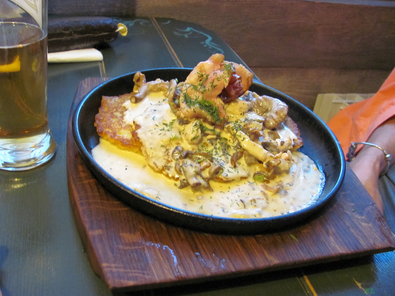 Ну и у нас осталось одно дело в Минске, из-за которого мы в основном сюда и приехали (вернее, не мы, а я). Как вы уже поняли, нам очень нравятся драники. Так вот поесть их и входило в наши планы. Я заранее поинтересовался заведениями, где это лучше сделать с сохранением бюджетности, и выбор по отзывам пал на кафе "Васильки", благо это кафе было буквально рядом со старым городом, тоже на проспекте. Судя по количеству народа в кафе, оно и вправду пользуется здесь популярностью. Мы с трудом нашли свободный столик, но официант, молодой и вежливый паренек, подошел мгновенно, да и потом обслуживал быстро и хорошо. Драниками мы не органичились, Марина еще взяла салатик, а я миску борща. Борщ, честно говоря, послабее вильнюсского, но тоже вполне себе. А вот драники - у Марины "С припеком", а у меня "Сельские" очень вкусные, получше каунасских картофельных блинов. Пиво белорусского изготовления "Златный базант" тоже вполне сочеталось с едой, хотя много его пить не хотелось - на улице значительно похолодало и мы выпили по кружечке. |
