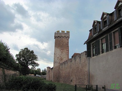 Недалеко от исторической части города большая бесплатная парковка, к ней нас вели дорожные указатели. Правда, она была почти вся забита и пришлось по ней немного прокатиться. На парковке еще и бесплатный общественный, но при этом совершенно чистый туалет, город любит своих туристов. Оберне впервые встречается в исторических документах 778-го года, на рубеже 11-го и 12 веков здесь был построен замок, примерно в 1280-м году город получает статус имперского. С 1679-го года он стал французским королевским городом, потеряв свою относительную автономию, которую имел в Священной Римской Империи (т.е. в первой немецкой империи).В 1871-м году город вместе со всем Эльзасом был аннексирован Германией. а в 1919-м году Франция снова вернула его к себе. От парковки по дорожке под крепостной стеной попадаешь в историческую часть города на пешеходную улочку. Но она быстро заканчивается, а там снова машины, они проталкиваются по городским улочкам, гудят клаксонами, шумят колесами по булыжнику и смазывают впечатление от города. И цветов здесь намного меньше, город не такой нарядный. После шкатулочного Эгисхайма и посещенных ранее и еще ранее других городков Эльзаса этот нас впечатлил меньше. Может, еще убавило красочности скрывшееся за облачками солнце. Тем не менее мы конечно постарались обойти всё что можно, посмотрели на фонтан, символ города - его колокольню, на церковь 18-го века. Из монопродуктовых магазинов тут нам встретился магазин нуги в самых различных вариациях.