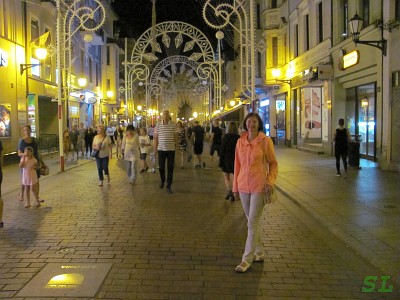 В отеле на рецепции нам выдали ключи и парень показал примерно на схеме города, где наш апартамент, пешком до него, по его словам метров 300. Поехали с помощью навигатора и выехали прямо на пешеходную улицу в центре города, люди смотрели на нас с удивлением, а навигатор говорил, что до цели осталось 150 метров. Но как.... Поэтому я развернулся прямо на пешеходке и назад. В общем, чтобы попасть к апартаментам, надо было объехать вокруг всей исторической части города и въехать в него с другой стороны. А с учетом того, что я промахнулся разок и поехал не по той полосе, мы крутнулись вокруг пару раз, километра 3 в результате прокатили:). Но потом всё же попали на нужную улицу, а вот и наш подъезд. Стоянка здесь везде запрещена, включили аварийки.