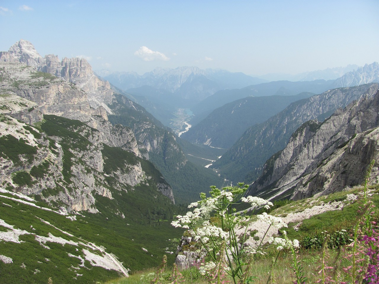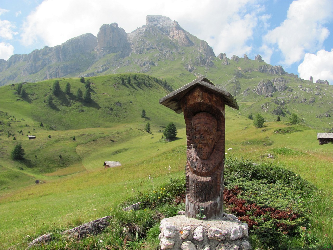 И мы побрели, крутя головами и фотоаппаратом то в одну сторону, то в другую. Сейчас я уже понимаю, что это самое красивое место из всех, что мы увидели в этой поездке, тогда еще этого не знал, но кажется, что чувствовал. Невозможно было не почувствовать... Фантастически прекрасные пейзажи окружали нас со всех сторон, хотелось идти еще дальше, там, наверное, еще красивее, и это так и было на самом деле. Причем, точно так же было и на обратном пути :). По дороге возле часовни нам встретился памятник первому восходителю на вершину основного пика (2999 м. н.у.м.) австрийскому альпинисту Паулю Грохману. За склоном на тропе было даже жарко, но когда мы прошли ко второму приюту, Лаваредо, из-за пиков подул довольно прохладный ветер и вспомнились ветровки, спокойно лежащие в багажнике машины. Но потом они забылись или ветер утих, честно говоря, я не помню. В общем, стало как-то не до них. Но стало поджимать время и мы, достигнув желаемого вида на Tre Cime, повернули обратно. Хотя здесь можно было провести и полный день, и еще потом приезжать не раз, потому что насмотреться на это чудо природы, именуемое Доломитовые горы, невозможно. Но мы поехали вниз. А нам навстречу, несмотря на то, что уже вечерело, продолжали подниматься машины, хотя основной поток уже шёл вниз. |