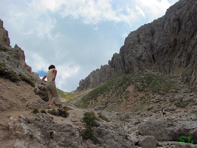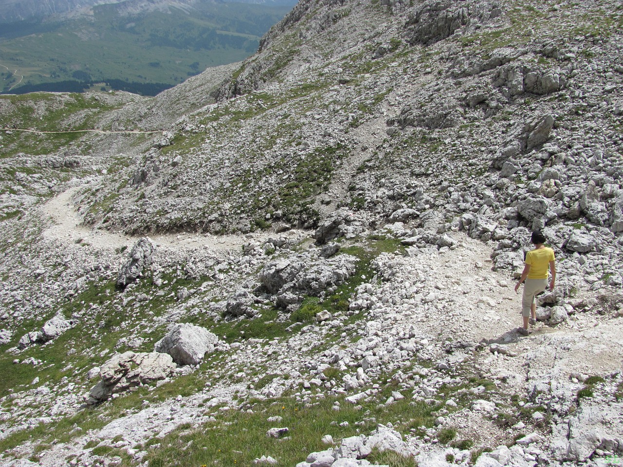 Там посидели на камушках у начала хребта Sella, самой высокой точкой которого и является Piz Boe, потом понаблюдали за началом полета парапланеристов, это всегда зрелищно, и какая станция подъемника обходится без них? А потом по тропе среди камней на плато пошли к дальнему приюту Kostner, до него километр или немного меньше, и тропа поднимается совсем немного, так что идти не трудно.