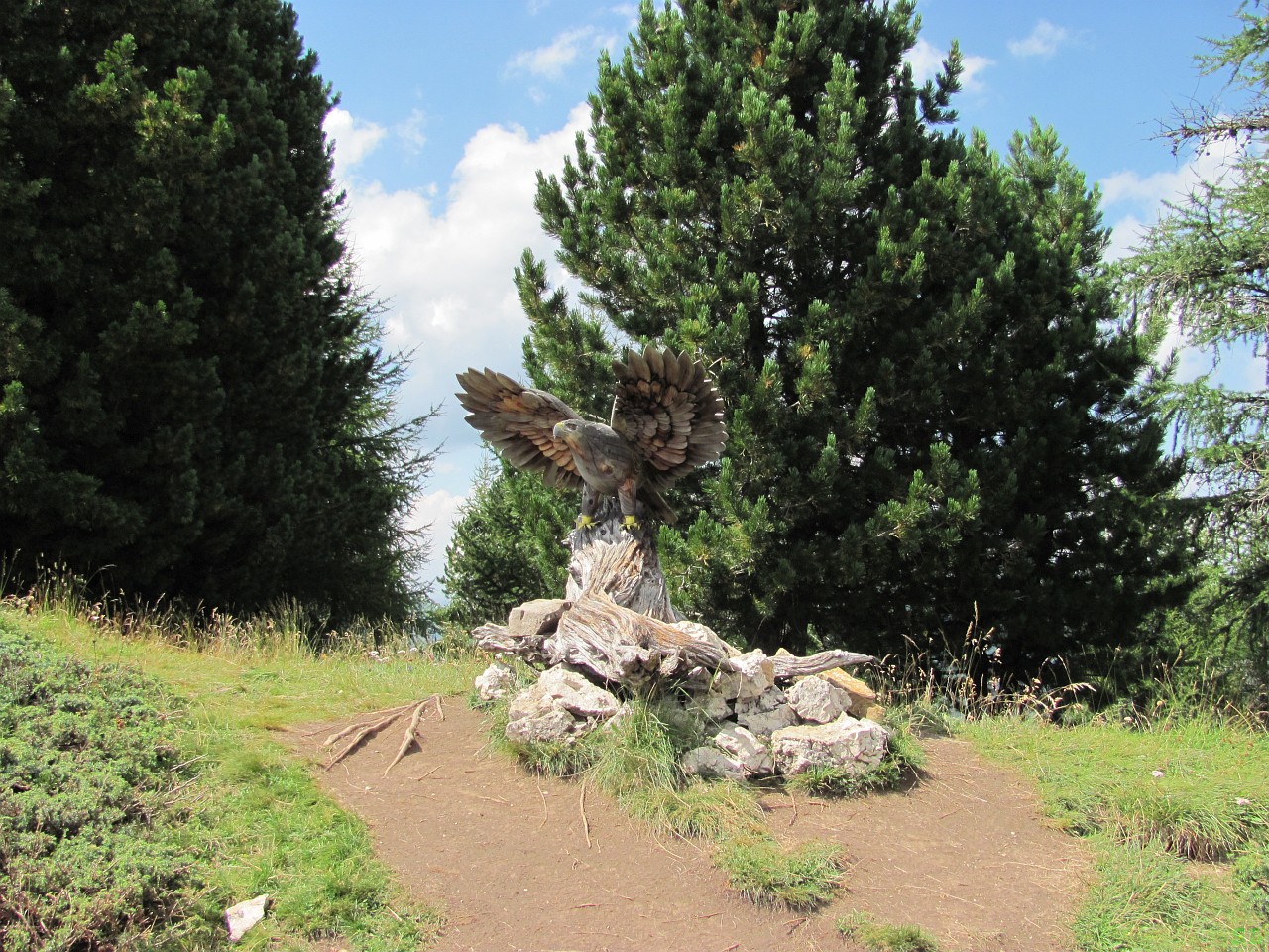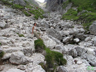 Как-то у меня в голове наше расположение относительно подъемников на карте и увиденных с балкона разошлось с реальным, и я увел Марину в сторону. Потом, когда поселок уже закончился, а желаемого все не было, ей всё же удалось убедить меня, что я Сусанин, и мы повернули назад. Потом пошли почти правильно, увидели подъемник, который я определил, как нужный, потом никак не могли найти к нему подход, покружив по улочкам вокруг. Вот они, кабинки, вот видно, куда спускаются, а где вход в это куда, не понимаем. Даже хотели в одном месте перелезть через забор, потому что за забором кабинки въезжали в здание. Потом нашли узкий проход между домами и поняли уже у кассы по схемам, что это не тот, это второй ,более низкий подъемник Col Alto. Сюда и народа-то почти не было. Покрутили головами - вон он, "первый" подъемник, метров 500 до него идти под жарким солнцем. Кстати да, уже на этой высоте солнце палило нещадно. Но хочется повыше и, делать нечего, пошли. С этим было все в порядке - большая станция, обозначенная указателями - сюда в кассу, туда на посадку, на дорожках синие следы нарисованы для тех, кто с указателями путается. Покупаем билеты только на подъем на двух подъемниках к подножию пика Piz Boé. Пик высотой 3152 метра. Обратно решили попытаться спуститься своим ходом, если получится. Если не получится, то билет на спуск можно купить и наверху. Стоимость одного билета 14.90 евро. Первый подъемник с названием Boé очень длинный, с желтыми закрытыми яйцевидными кабинками привез нас на высоту 2200 метров в окрестности одноименного озера (Lago) Boé. Мы там просто прогулялись, к озеру не пошли, оставив его посещение на обратный путь. Следующий подъемник душевнее, открытые диванчики на проволочке :) и поднимают они на высоту 2500 метров к приюту Franz Vallon. Ну вот, казалось бы, что за разница в высоте, 300 метров всего, но окружение и природа сразу переменились. От станции уходили вправо и влево натоптанные маршруты, пошли вправо.