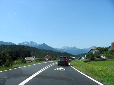 На въезд в Блед стояла приличная, на пару километров, пробка, мы ехали ей навстречу, правда, тоже пришлось немного потолкаться. А вскоре уже свернули на знакомую нам по 2008-му году довольно крутую горку к границе в Korensko Sedlo (Коренский перевал) по направлению к Австрии. Нас больше устраивал проезд по Австрии в основном из-за дешевого бензина, мы планировали залить бак перед границей с Италией как можно полнее. К слову сказать, и навигатор нам сразу предложил такой вариант маршрута.