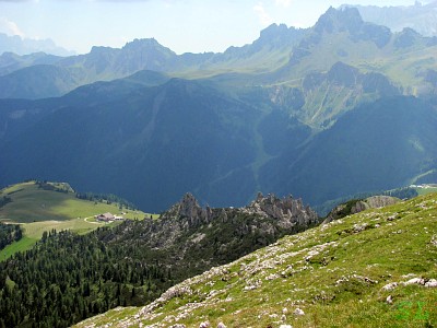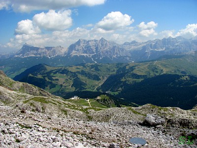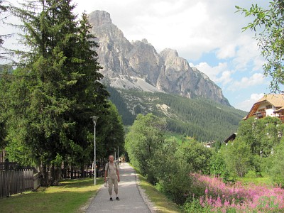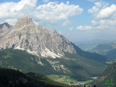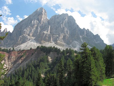 Ну, а потом собрались, положили в рюкзак куртки, кепки, воду и пошли покорять горы :). Честно говоря, виды на них практически с нашего крыльца уже были вполне впечатляющими, и можно было бы никуда не ходить, а просто посидеть на лавочке на тенистой лужайке около нашего отеля и посмотреть на возвышающуюся прямо над отелем гору Сассонгер (Sassongher) (2665 м), которая в общем-то является символом этого места. Но это не для нас, маловато будет ...(с). |