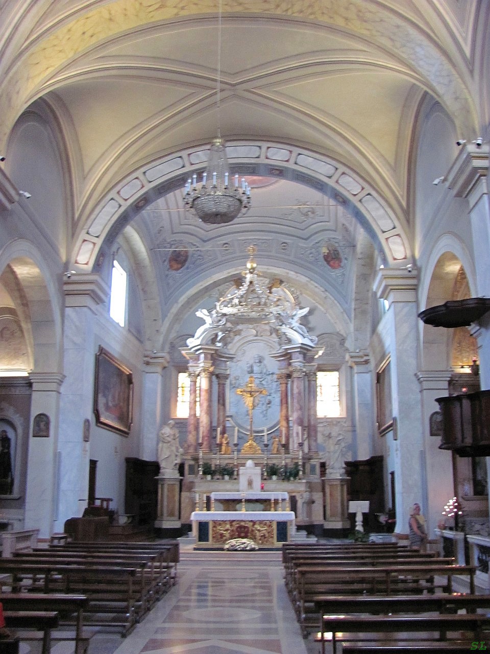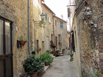 Согласно античной легенде, Семпрониано был основан консулом Семпронием Гракхом, который после основания колонии в Сатурнии, полюбил холм Семпрониано настолько, что пожелал основать новый город, принявший его имя. Значит, это произошло где-то в 150-м году д.н.э. Других упоминаний о возрасте городка я не нашел. Официальная документация о городке датируется тысячным годом и, как практически все здесь, связана с семьей графства Альдобрандески. То, что городок старинный и живет своим спокойным укладом практически с того времени, понятно и так. В это утреннее время здесь практически никого не было, кроме нескольких старушек, потихоньку поднимающихся с продуктовыми пакетами из магазина и рынка, уборщика с метлами и нас с фотоаппаратом. И мы с уборщиком явно друг другу все время мешали, но наши маршруты как-то совпали и не желали расходиться, несмотря на все наши общие ухищрения :). Историческая часть городка поднимается на холме сначала лестницами, одна из которых парадная, а потом узкими крутыми улочками и заканчивается на верху подобием обзорной площадки со старинным храмом 12-го века. Главная же церковь св. Винченцы и Анастасии никак не хотела попадать в объектив, потому что она плотно обустроена домами вокруг нее. Церковь тоже 12-го века, отреставрирована в 1579-м году.