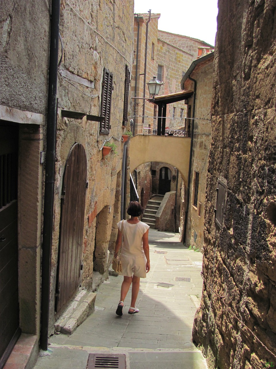 Чем ближе мы подъезжали к этому очередному туфовому городу этрусков, тем все больше дорога становилась похожей на тоннель, по её обеим сторонам высились отвесные туфовые стены, дорога была прорублена через горы, возможно, еще этрусками. Город Питильяно высился над дорогой на высоком холме, мы постепенно его огибали, рассматривая снизу, а потом стали подниматься вверх, иногда довольно круто, при этом вполне уже можно было радоваться видами из окна автомобиля. Трасса проходила практически через центр города и машинка, брошенная хозяином на обочине с аварийкой, создавала внушительную пробку, пока тот пил кофе в соседней кафешке. Пробка на довольно крутом и длинном подъеме на узкой старинной улочке с брошенными машинками - это круто :). На перекрестке, который главной дорогой поворачивал крутым узким серпантином, в котором с трудом умещалась наша машинка, пытался регулировать движение совершенно спокойный (для итальянца) полицейский. Мы повернули, и стало понятно, что вот он, центр, вокруг нас, и надо пристраивать машину. Но тут это дело не простое и, хоть мы были согласны на платные варианты, но они все были заняты и мы потихоньку двигались дальше, пока не увидели свободное место на улочке, причем это место уже было совсем бесплатным. Встречные машины терпеливо подождали, пока я втиснул свою каравеллу в отведенное ограниченное пространство, и машина была припаркована, даже частично в тени. Правда, пришлось сложить мое зеркало, уж больно улочка узка. И потом обратной дорогой мы пошли по направлению к центру этого старинного города. Идти пришлось немного меньше километра, зато мы были вознаграждены выставочными видами на город. И через 15 минут мы уже спустились по узкой лестнице в центр на маленькую площадь. Здесь нам удачно встретился офис туринфо, в нём мы взяли план городка и его достопримечательностей и потопали осознанно от цифры к цифре. Но на мой взгляд, это ничего не меняло, мы бы, наверное, и так пошли бы по тому же маршруту. История Питильяно начиналась еще в бронзовом веке (XII-XI в. до н.э.), здесь тогда появились поселения этрусков. Тут найдены остатки укреплений 5-го и 6-го века до н.э., а современная история городка начинается в 1061-м году нашей эры, тогда этот городок был упомянут как официальная резиденция семьи графства Альдобрандески. В общем жутко старинный городок. В конце 16-го века Орсини уступил крепость и городок семье Медичи за долги, которым до Питильяно дела не было, и город стал приходить в упадок. И только в начале 18-го века он стал снова развиваться и сейчас входит в список самых красивых деревень Италии. На площади Республики, наверное, самой большой площади в исторической части огромными кубами выделяется строгий дворец 16-го века Орсини (Palazzo Orsini), в котором располагается археологический музей. Здесь же, на площади, можно наполнить емкости водой из источников и напиться. А потом мы начали кружить по узким городским улочкам и наслаждаться видами. На лавочках около своих подъездов тут и там сидели старики и старушки и обсуждали нас, снуюших мимо них день за днем нескончаемым потоком. Питильяно построили этруски на 600 метровом туфовом холме, городок из-за этого считался неприступным и назывался он сначала Statnes. В Римскую эпоху название превратилось в Статонию. А свое нынешнее название город получил от имен двух знатных р