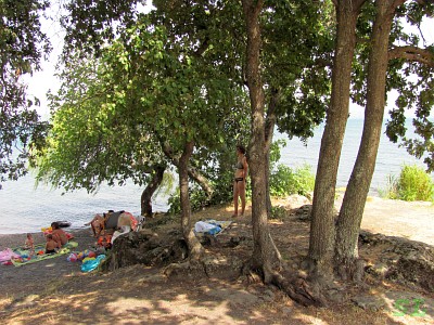 Вулканическое озеро закончило свое образование сравнительно недавно, за 100 лет до нашей эры. Максимальная глубина 151 метр, средняя 80 метров. Но нас интересовала не его история или максимальная глубина, а возможность поплавать, т.е. больше всего температура воды. При этом мы немного опасались, что озеро будет таким же холодным. как Гарда, хотя умозрительно понимали, что холоду тут особо взяться неоткуда. По указаниям навигатора, проехав через интересный городок Градоли, направились к точке на западном берегу озера, которую я определил примерно и заранее. Он нас увез на север, потом спустил на берег и по нему мы и покатили, получив возможность выбрать приемлемое место для купания и парковки. Машину хотелось поставить в тени. Честно говоря, здесь почти один сплошной пляж и на них места всем хватало. Поэтому проехали недолго и я увидел окошко в редкой тени оливковых деревьев. Ну какая есть и той рады. Потом нашли место на берегу в тенёчке уже для себя и, не дав себе остыть, пошли в воду. Вода оказалась приятной по температуре, наверное, 23-24 градуса, то что надо для комфортного плавания. Вода прозрачная, вход по мелким камушкам, но терпимо. А подальше от берега вроде песочка под ногами. В общем наплавались вволю и потом залипли в тенечке в дреме. За это время рядом с нами, среди камней, там где только что я фотографировал Марину, устроились дедушка с внуком с удочками, неспешно разобрали и закинули снасти. Через полчасика дедушка потянул одну удочку и на крючке вполне себе солидный линь. На фоне внука так вообще большой. Пока дед с внуком успешно добывали себе ужин, мы еще поплавали и так разнежились, что вот никуда бы уже и не ехать. Но надо. |