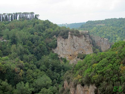 По уже привычной дороге проехали мимо созвучной "вчерашней" Сованы, мимо поворота на Питильяно и снова мы буквально пронизываем местные холмы через рукодельные туфовые ущелья. Снова этруски постарались? Потом мы немножко покатались у стен города, места для стоянки сначала не нашли, хотя я один раз попытался примоститься на краю обрыва, но Штурман категорически запретила, пришлось на этом краю разворачиваться, потом потихоньку поехали, поехали и приехали на бесплатную парковку над городом, от которой идет дорожка на мост прямо в историческую часть города. Пусть на солнце, но сегодня оно немного прикрыто облаками и не очень критично. Правда, персики в машине, купленные недавно на рынке, но подумалось, что им ничего особо не должно быть, еще слаще станут :). |
