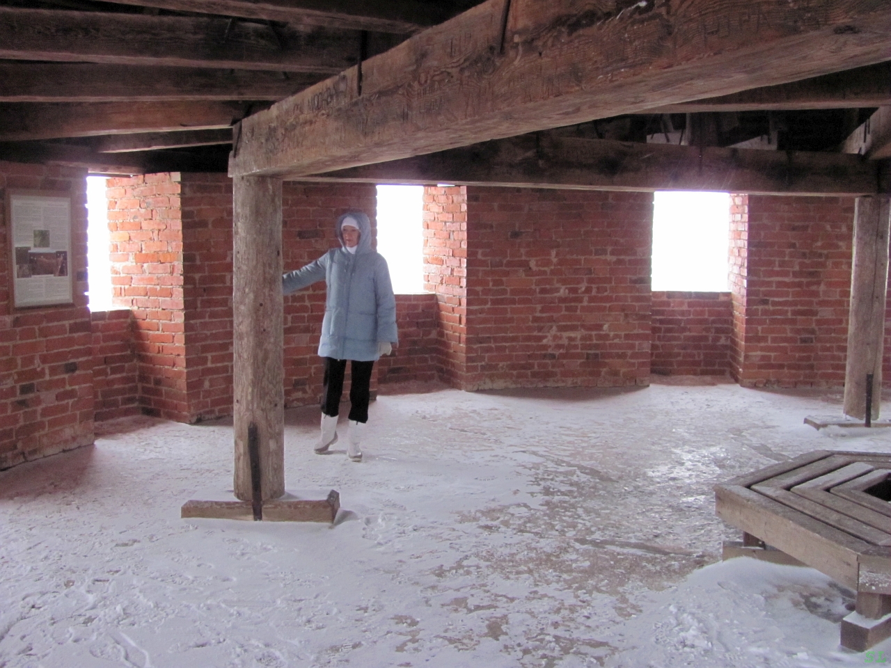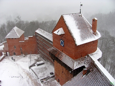 Почему-то у меня о Сигулде были неправильные представления. Я ожидал увидеть типичный маленький европейский городок с соответствующими зданиями и улочками, а мы приехали в поселок с большой привокзальной площадью, немного прокатились по нему и поставили машину на площади перед каким-то банком. Снег идёт, но пореже. Вышли, прошли туда-сюда, спросили у проходящей мимо женщины, а где тут центр, она сказала, что центр здесь, где стоим.... В местной Максиме посмотрели, нет ли комаровского имбирного печенья в коробках - нет. Потом я увидел стрелку на столбе на туринфо и мы пошли туда. Оно оказалось в здании железнодорожного вокзала сбоку. Девушка нам на схеме ткнула ручкой - вот развалины нашего старого замка, вот тут есть пещера, есть санно-бобслейная трасса, а дальше Турайда и там тоже замок. Если ехать на машине, то все по пути. И мы вернулись к машине, сели в нее и мимо развалин, которые так и не увидели, и пещеры, в которую не захотелось, уехали в Турайду. Вот и вся Сигулда. Последующее уточнение информации о Сигулде подтвердило наши впечатления. Кроме указанного здесь еще есть канатная дорога и практически вот и всё. Визуально мы заметили, что прямо в городе большой парк из елей и, видимо, в теплое время года здесь очень неплохо погулять. Потом еще ехали мимо холма Дайна и там тоже проложена масса пешеходных троп и лесенок. Т.е. летом тут есть чем заняться. Мы же приехали к замку в Турайде, поставили машину на парковке напротив входа. Парковка помечена платной, но платить некому. Наверное, зимой или в метель она бесплатна. Вход на территорию замка платный, стоит 3 евро со взрослого, пенсионерам 2.15. Я шутки ради попросил пенсионерские билеты, но кассир совершенно серьезно продала нам два за 4.30. Полтора евро в кармане :). (Летом, кстати, вход пенсионерам вдвое дороже, а остальным по 5 евро). Турайдский замок, воссозданный и, по-моему, еще не до конца, начали строить в 1214-м году на месте деревянного замка ливов. И строили его, строили, пока он не сгорел в 1776-м году. С тех пор до нашего времени замок не восстанавливался и только в 1953-м году начались работы по возвращению его облика. Но в 2000-м и они были прекращены. Правда, в настоящее время следы стройки снова наблюдаются, значит что-то еще построят. В начале нашей экскурсии в парке не было вообще практически никого, а к завершению уже народа набежало. Вот здесь я в первый раз заметил, и потом это наблюдение только утвердилось, что в основных туристических местах в Латвии присутствуют только русские и слышна только русская речь. Первой нам встретилась могила Турайдской розы. Кроме красивой легенды, которую мы прочитали уже потом, дома, мы обратили на нее внимание из-за кольца, сделанного веткой или корнем дерева. Не знаю, само или специально так сделалось? Затем нам встретилась замечательная церковь, как оказалось, одна из самых древних деревянных церковей Латвии, построенная на церковном холме в 1750-м году. До нее на этом же холме были еще две церкви. Следом за церковью в доме садовника довольно большая экспозиция, посвященная истории местной народности - гауйским ливам. Честно говоря, погода очень способствовала тому, чтобы мы осматривали внутренние экспозиции не спеша :). Но погода погодой, а надо было осмотреть всё и мы пришли собственно в замок, поднялись на смотровую площадку Главной башни. Это самое старое 5-т